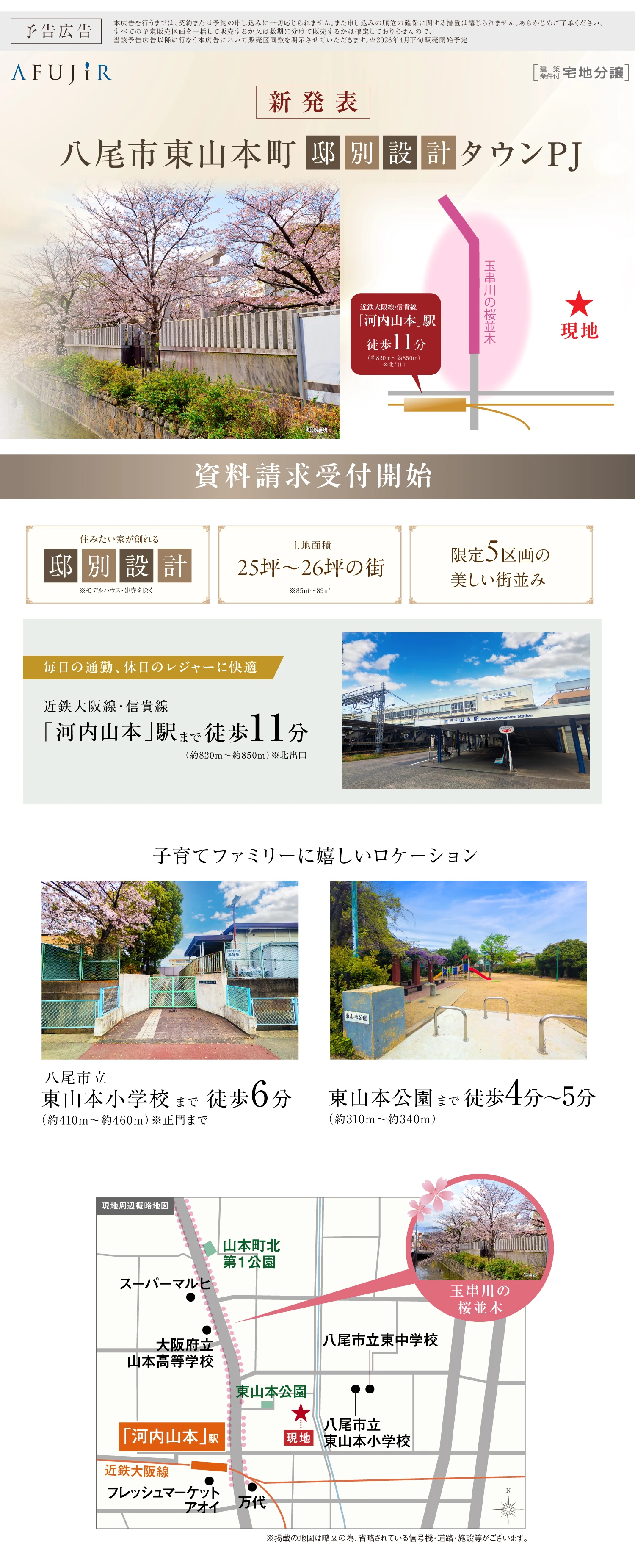 物件名称 (仮称)八尾市東山本町邸別設計タウンPJ 所在地 大阪府八尾市東山本町五丁目240番1より分筆 交通 近鉄大阪線・信貴線「河内山本」駅まで徒歩11分