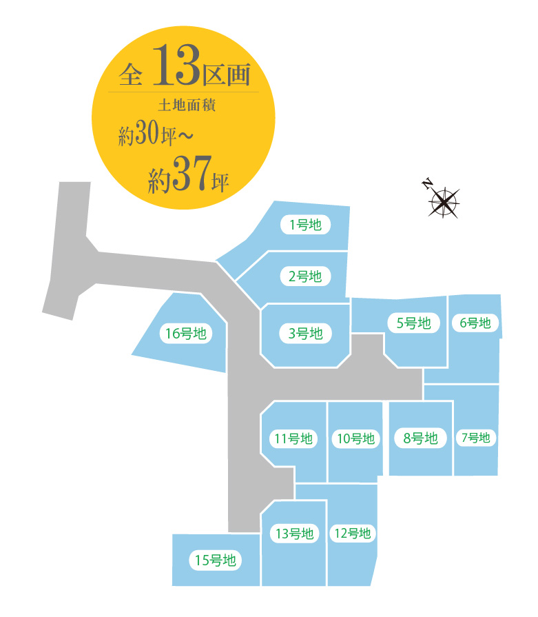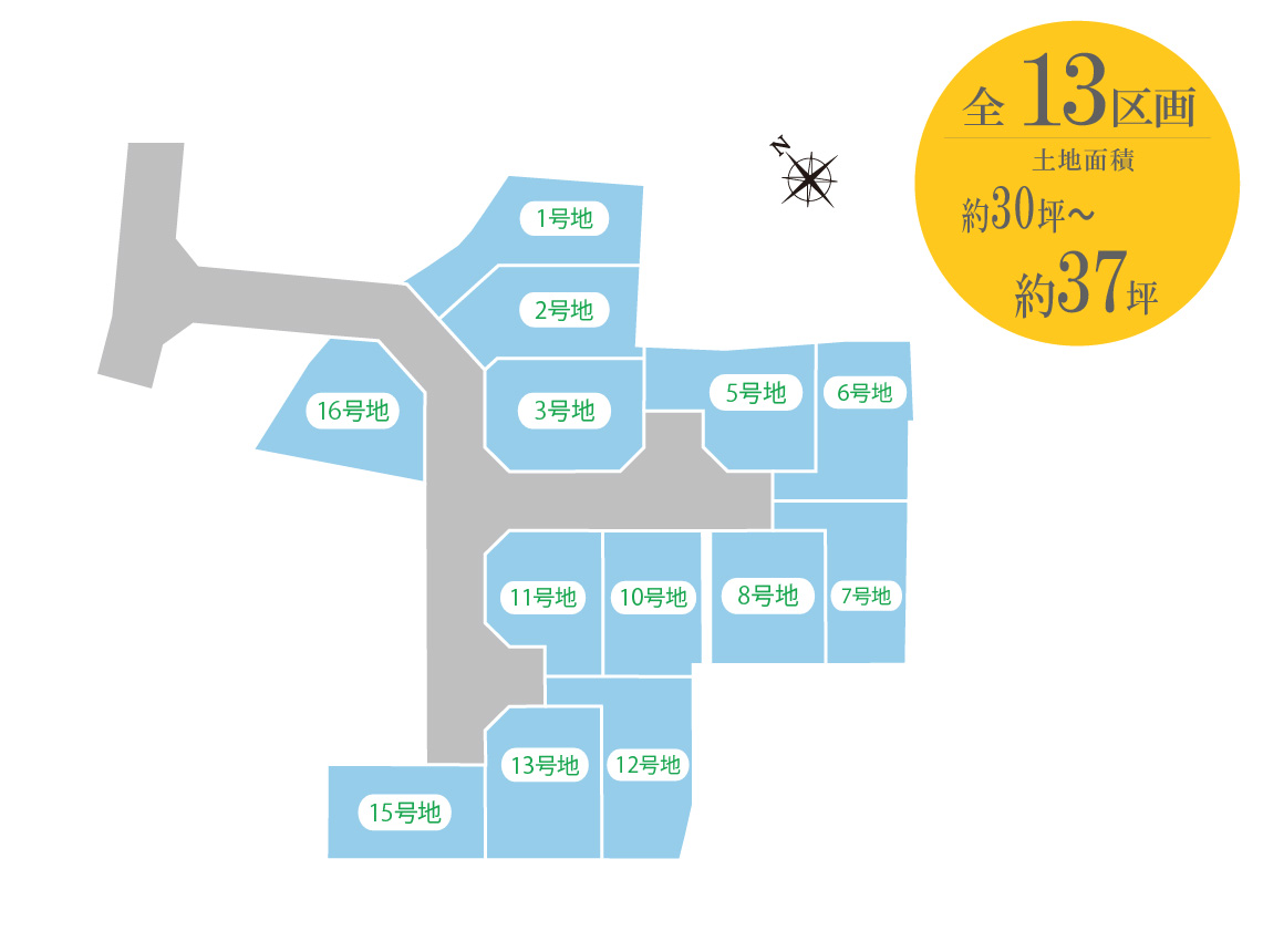 ※掲載の全体区画図イメージイラストは図面を基に描き起こしたもので、イメージにつき実際とは異なります。また、行政の指導等により変更となる場合がございます。フェンス等は一部省略しております。