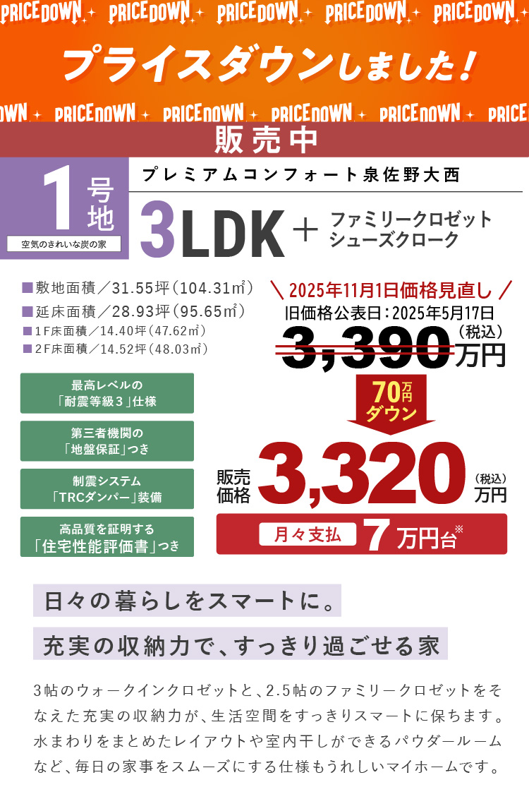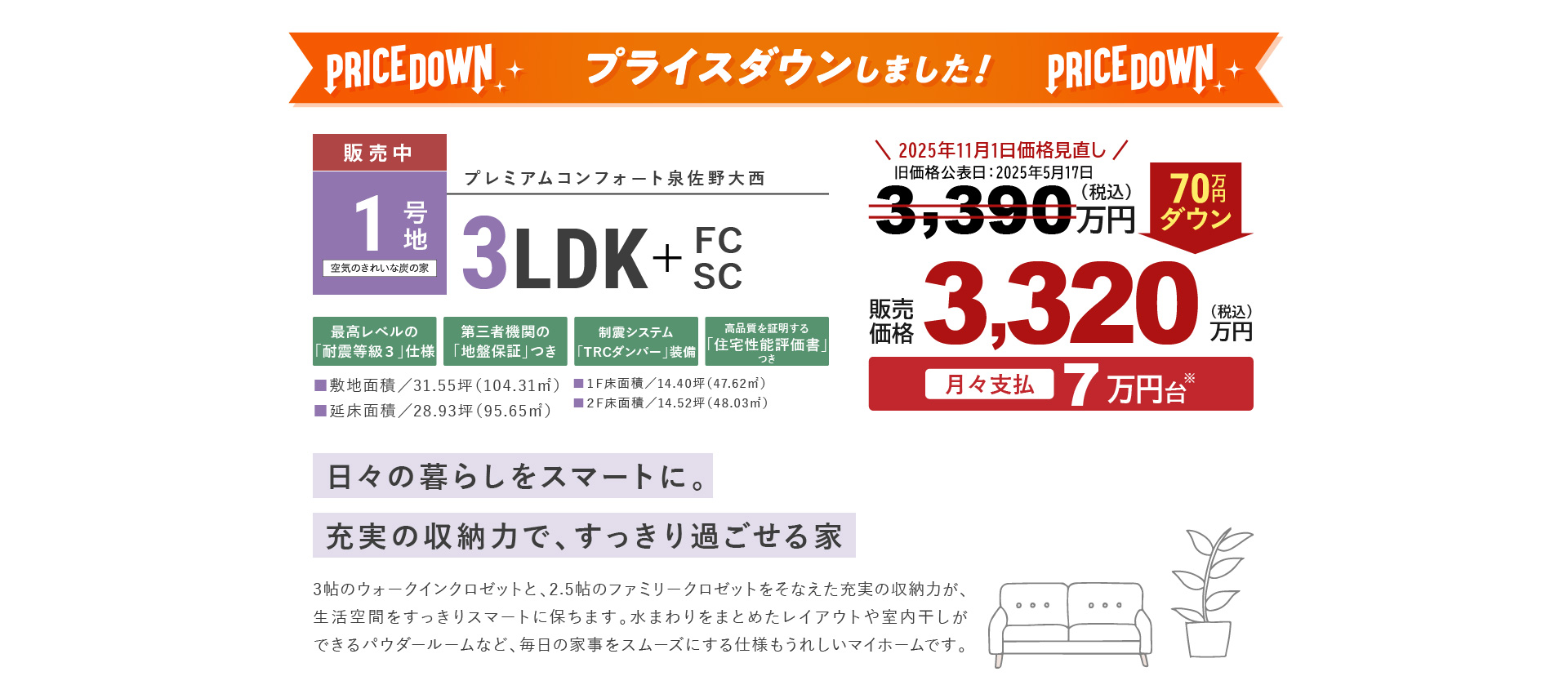 - NEW 【プレミアムコンフォート泉佐野大西】新築一戸建て1号地がプライスダウン!