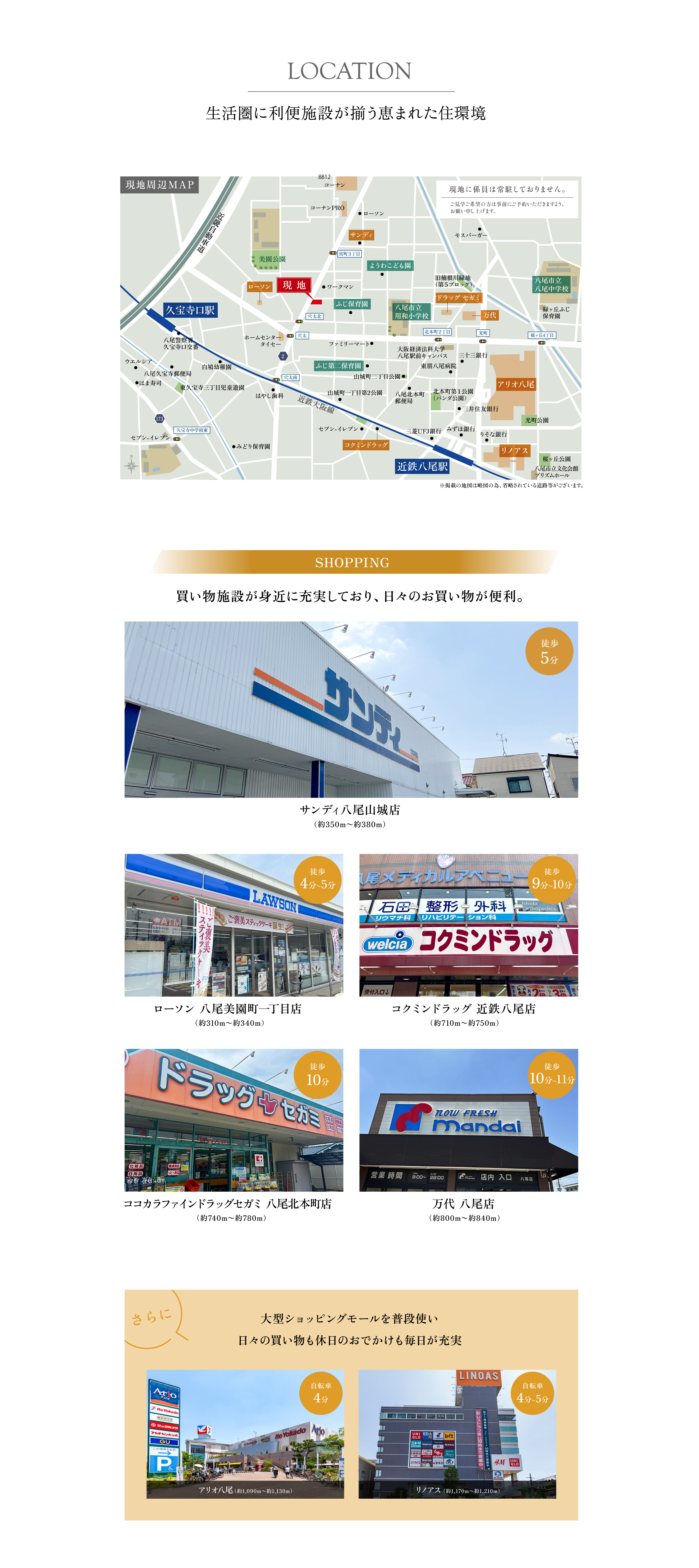 ローソン八尾美園町一丁目店まで徒歩4分~徒歩5分(約310m~約340m) サンディ八尾山城店まで徒歩5分(約350m~約380m) ファミリーマート八尾山城町店まで徒歩5分~徒歩6分(約390m~約430m) コーナンPRO八尾楠根店まで徒歩6分(約420m~約440m) ローソン 八尾楠根町店まで徒歩6分(約420m~約450m) サンディ 八尾モール店まで徒歩8分(約600m~約640m) ローソン佐堂町三丁目店まで徒歩8分~徒歩9分(約620m~約660m) コクミンドラッグ近鉄八尾店まで徒歩9分~徒歩10分(約710m~約750m) ココカラファインドラッグセガミ八尾北本町店まで徒歩10分(約740m~約780m) ダイコクドラッグ近鉄八尾駅前店まで徒歩10分~徒歩11分(約780m~約820m) 万代八尾店まで徒歩10分~徒歩11分(約800m~約840m) セブン-イレブン八尾萱振町3丁目店まで徒歩12分(約900m~約940m) セブン-イレブン八尾光町一丁目店まで徒歩12分(約910m~約940m) ウェルシア八尾久宝寺店まで徒歩12分(約920m~約960m) オーエスドラッグ八尾店まで徒歩12分~徒歩13分(約950m~約990m) コノミヤ近鉄八尾駅前店まで徒歩12分~徒歩13分(約950m~約990m) マツモトキヨシ八尾店まで徒歩13分(約1,000m~約1,040m) ハーベス 近鉄八尾店まで自転車4分(約1,040m~約1,080m) アリオ八尾まで自転車4分(約1,090m~約1,130m) イトーヨーカドーアリオ八尾店まで自転車4分(約1,090m~約1,130m) リノアスまで自転車4分~自転車5分(約1,170m~約1,210m) セブンイレブン八尾光町店まで自転車5分(約1,310m~約1,350m) コノミヤ大蓮東店まで自転車5分(約1,430m~約1,460m) ファミリーマート八尾光町店まで徒歩13分(約1,000m~約1,030m) キャンドゥ桜ヶ丘店まで自転車5分(約1,450m ~約1,480m) 業務スーパー桜ヶ丘店まで自転車6分(約1,520m~約1,560m) スーパードラッグシグマ大蓮店まで自転車6分(約1,520m~約1,560m) サンディ八尾旭ヶ丘店まで自転車6分(約1,550m~約1,580m) 関西スーパー旭ヶ丘店まで自転車6分(約1,620m~約1,660m) ドラッグセガミ旭ヶ丘店まで自転車6分(約1,600m~約1,640m)