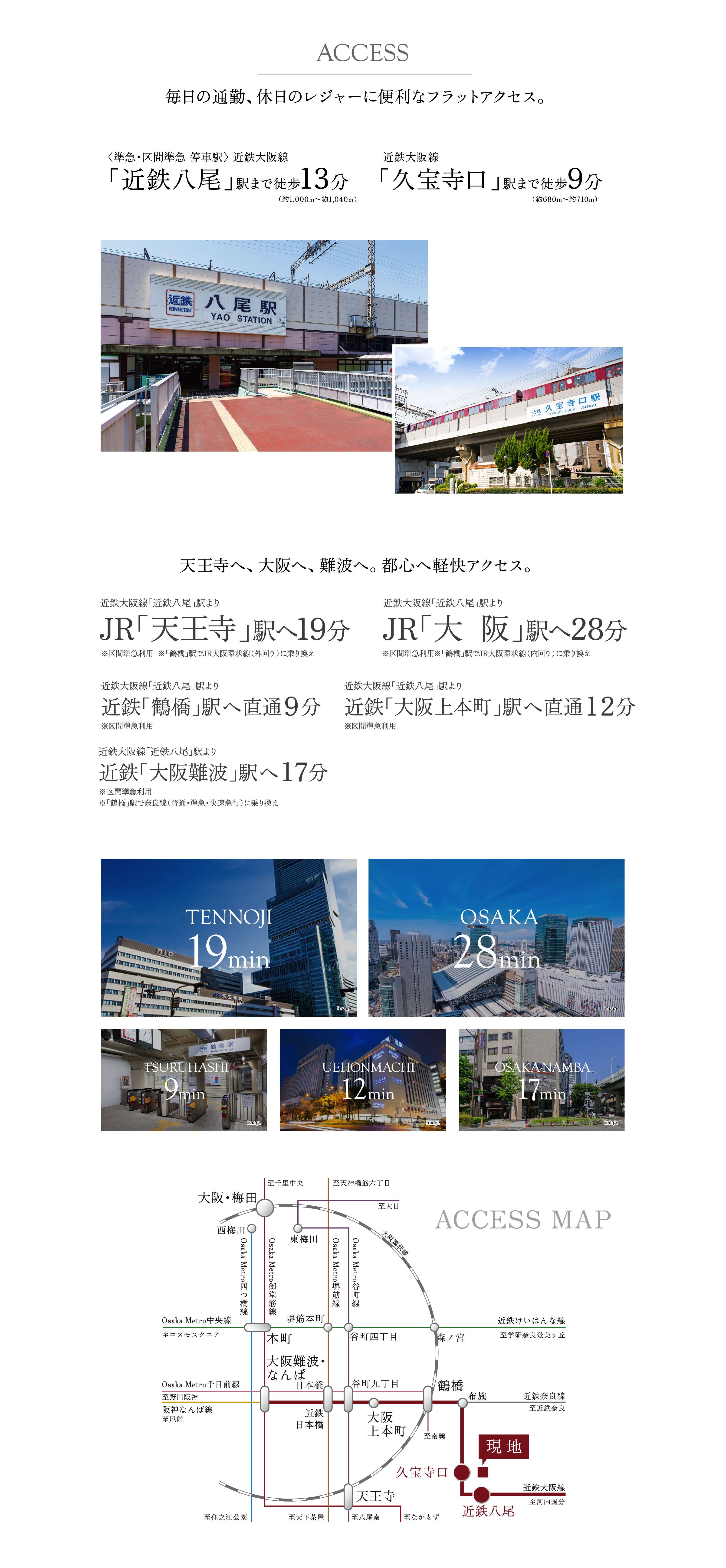 近鉄大阪線「八尾」駅まで徒歩13分(約1,000m~約1,040m) 近鉄大阪線「久宝寺口」駅まで徒歩9分(約680m~約710m)