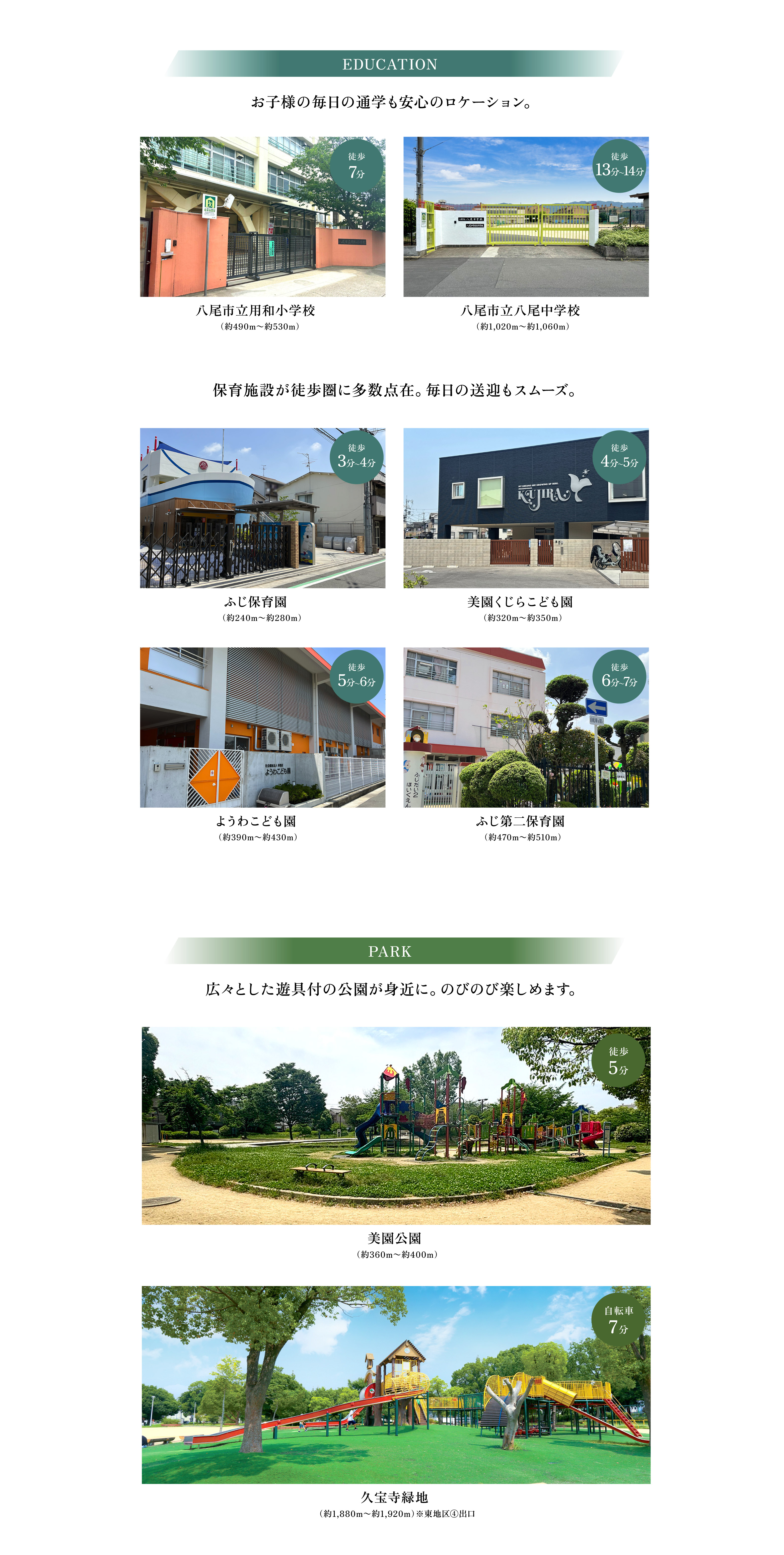 八尾市立用和小学校まで徒歩7分(約490m~約530m) 八尾市立八尾中学校まで徒歩13分~14分(約1,020m~約1,060m) 認定こども園ふじ保育園まで徒歩3分~徒歩4分(約240m~約280m) 美園くじらこども園まで徒歩4分~徒歩5分(約320m~約350m) ようわこども園まで徒歩5分~徒歩6分(約390m~約430m) ふじ第二保育園まで徒歩6分~徒歩7分(約470m~約510m) げんき保育園久宝寺園まで徒歩8分~徒歩9分(約640m~約680m) 白鳩幼稚園まで徒歩9分(約660m~約700m) キッズスペース梓国際学院まで徒歩9分~徒歩10分(約710m~約750m) ふじ保育園分園あかばすまで徒歩10分(約730m~約770m) ちびっこランド八尾園まで徒歩12分~徒歩13分(約950m~約990m) 認定こども園こどものいえまで徒歩13分(約1,000m~約1,040m) ひかりまち保育園 まで自転車4分(約1,090m~約1,130m) 認定こども園緑ヶ丘ふじ保育園まで自転車4分(約1,120m~約1,160m) ふじ保育園分園りぼん保育園まで自転車5分(約1,330m~約1,370m) 豆の木保育園まで自転車5分~自転車6分(約1,490m~約1,530m)