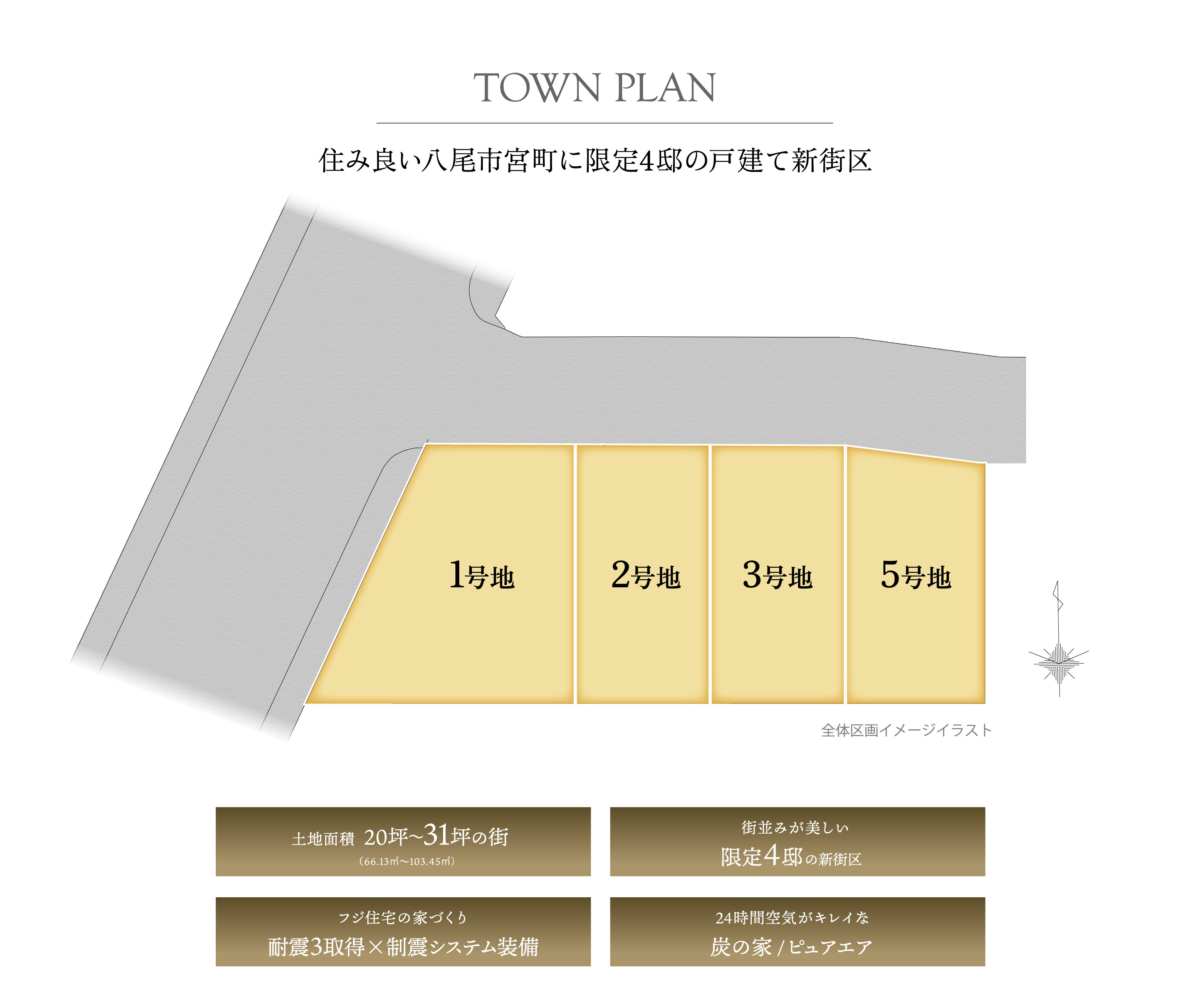 総区画数 4 区画 土地面積 66.13㎡~103.45㎡ 建物面積 97.32㎡~101.05㎡ 間取り 3LDK・4LDK 用途地域 準工業地域 地目 宅地 建ペイ率 70%(1号地:角地緩和適用、2.3.5号地:準防火地域内の準耐火建築物緩和適用) 容積率 200% 電気・ガス 関西電力・都市ガス 水道 公営水道 下水:公共下水 道路幅員 西側:10.00m(府道)、北側:4.70m(位置指定道路) 私道負担 有り(前面道路)1号地(14㎡)、2号地(13.86㎡)、3号地(13.88㎡)、5号地(14.47㎡) 開発許可番号 なし 造成完了時期 2023年7月 その他法令 準防火地域、文化財保護法(宮町遺跡)、景観法、宅地造成及び特定盛土規制法、都市再生特別措置法、特定都市河川浸水被害対策法、航空法 売主 フジ住宅株式会社