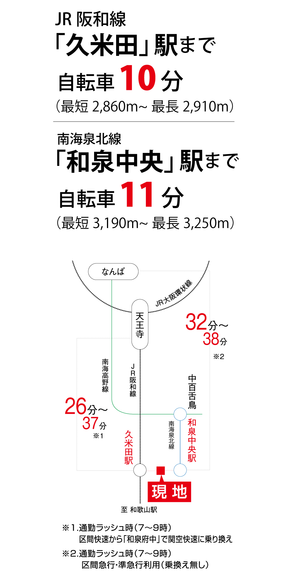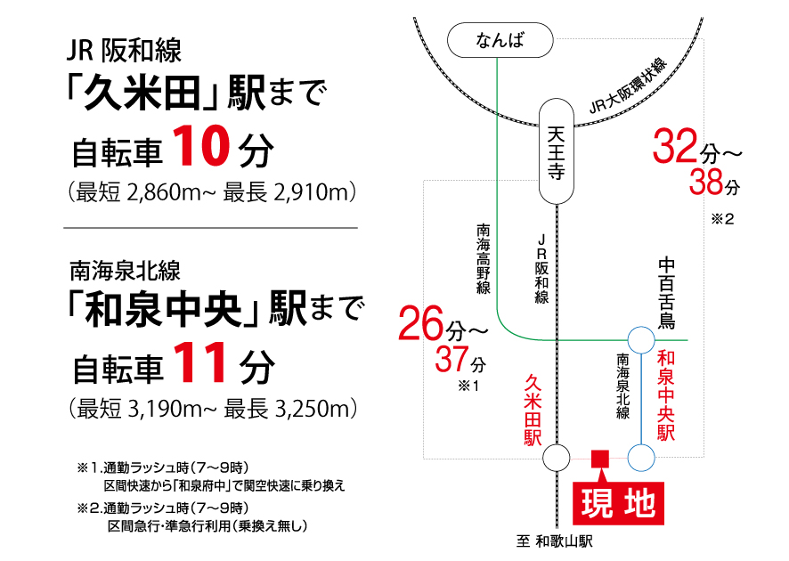 JR阪和線「久米田」駅 自転車10分(約2,860m~2,910m) 南海泉北線「和泉中央」駅 自転車11分(約3,190m~3,250m) 「城東小学校前」バス停留所 徒歩16分~17分(約1,280m~1,340m)南海ウィングバス乗車でJR阪和線「久米田」駅まで10分・南海泉北線「和泉中央」駅まで15分