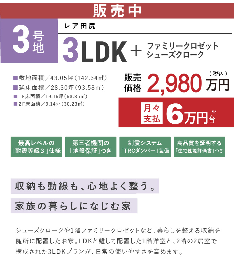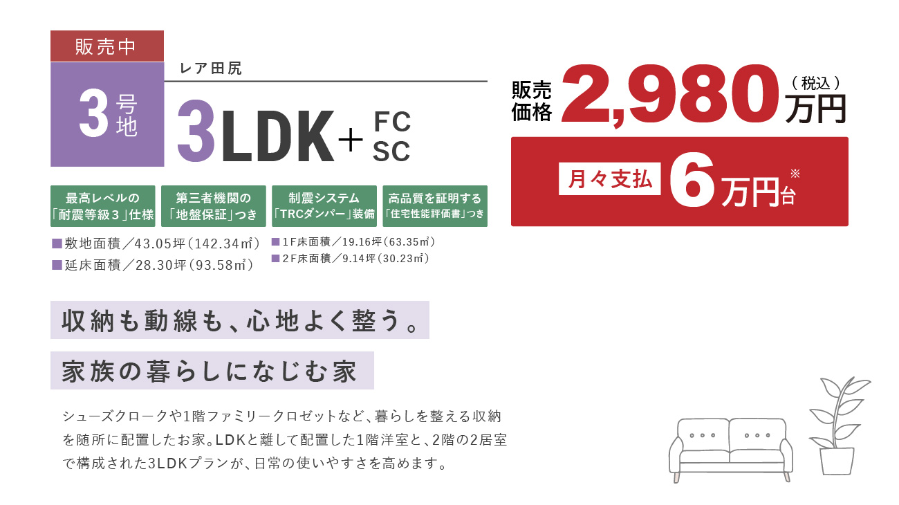 区画名称 レア田尻 3号地 販売戸数 1 戸 販売価格 2980万円 外構・付帯工事費 販売価格に含む 間取り 3LDK+FC+SC 建物面積 93.58㎡(28.30坪) 土地面積 142.34㎡(43.05坪) 建築確認番号 第トラスト25-1473号(2025年11月4日) 完成時期(築年月) 2026年2月 入居時期 契約後3か月 構造・規模 木造(在来軸組工法) 販売スケジュール 先着順 取引条件の有効期限 2026年4月7日 売主 フジ住宅株式会社 問い合わせ 0120-24-0413 ※諸費用/自治会費、登記費用、並びに住宅ローンご利用の方は利用するローンの規定と利用形態に応じた保証料・事務手数料及び火災保険料等が必要になります。 ※先着順につき、契約済の場合がございます。あらかじめご了承ください。 ※販売価格には、消費税(10%)相当額が含まれます。 ※契約・手続きの状況によってはご希望の時期にご入居出来ない場合もございますので事前に担当者にご確認ください。 ※完成時期(築年月):建設中の場合は、建物が完成する時期を、完成済みの場合は建築された年月を表示しています。 ※販売価格には外構・付帯工事費が含まれます。 ※個別合併処理浄化槽の維持管理費として年間約50,000円程度必要です。