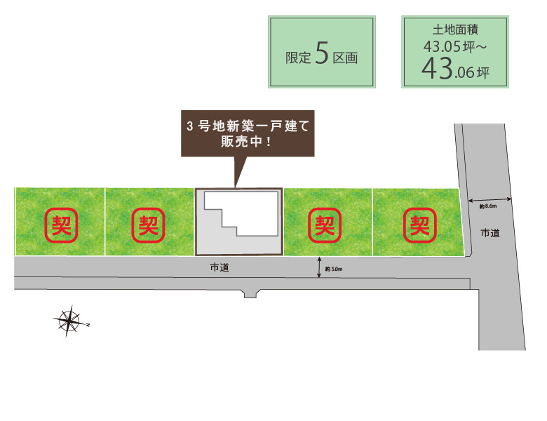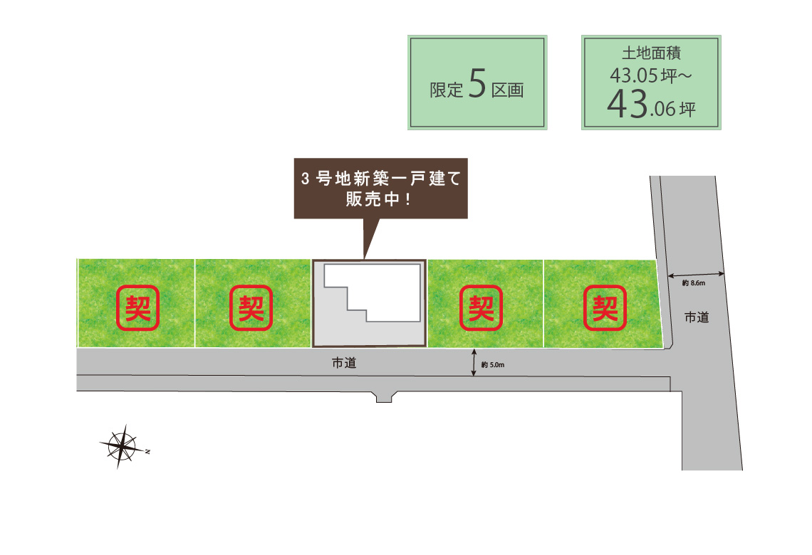 総区画数 5 区画 用途地域 第一種住居地域 地目 宅地 建ペイ率 60% 容積率 200% 電気・ガス 電気:関西電力、ガス:無し(オール電化設備) 水道 公営水道 排水:公共下水道なし(別途、個別浄化槽が必要になります。) 道路幅員 5.0m(東側、42条1項1号)、8.6m(北側、42条1項1号) 私道負担 無し 開発面積 711.71m2 開発許可番号 小規模団地につき開発許可番号無し 造成完了時期 完了済み(2023年1月) 宅地面積 142.34m2(43.05坪)~142.35m2(43.06坪) 売主 フジ住宅株式会社