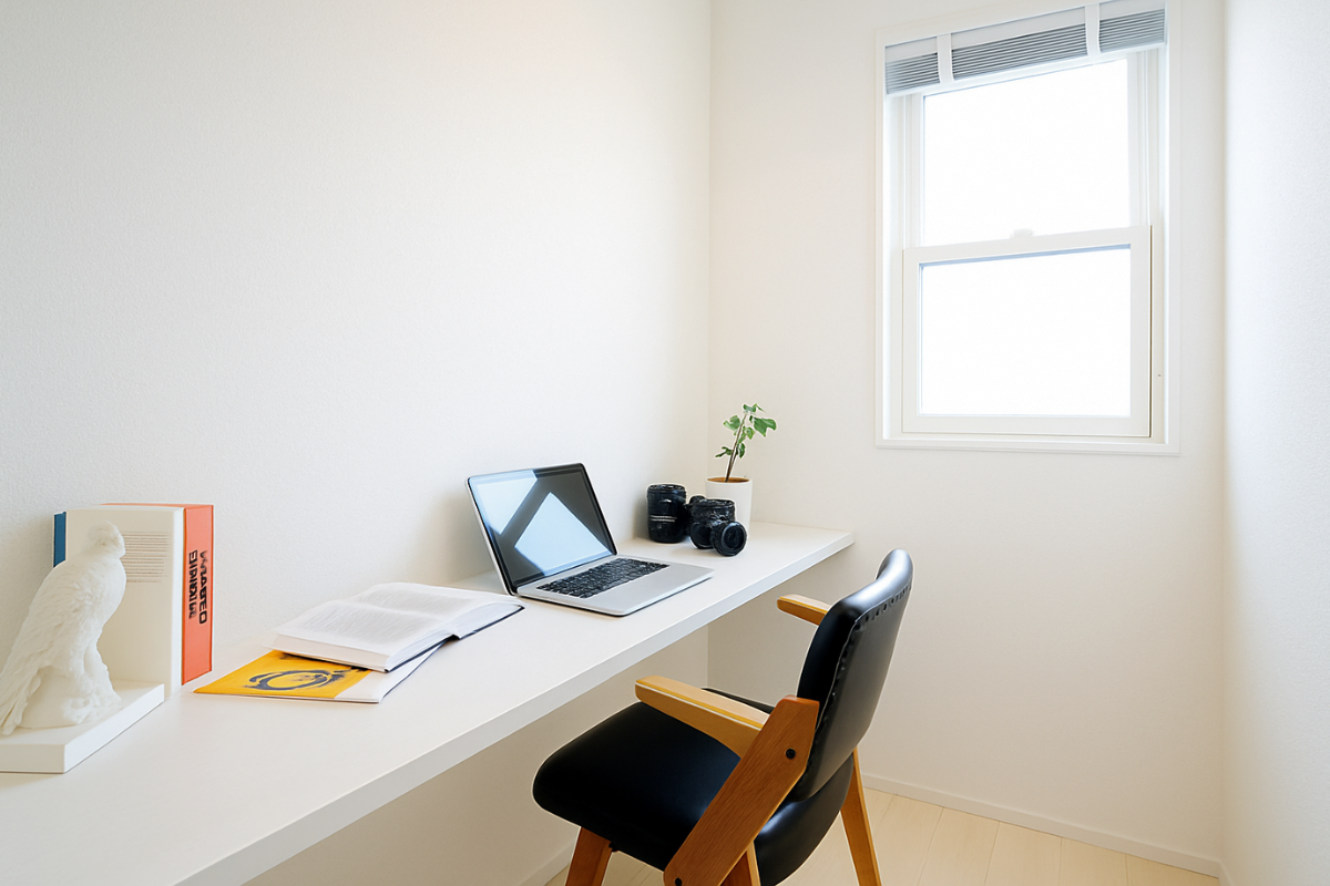 寝室には書斎スペースを設け、仕事用のワークスペースとしてはもちろん、