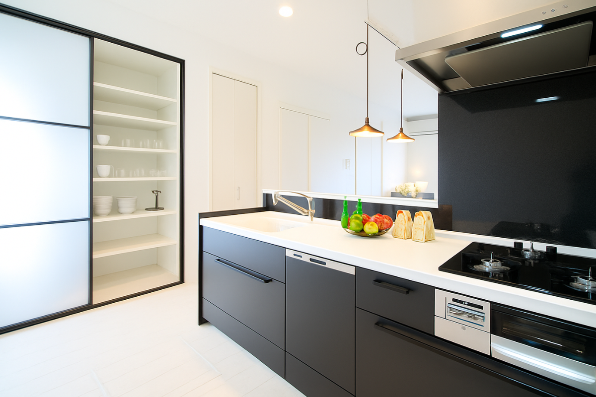 キッチンと統一感のあるブラックのアルミ製引き戸を採用し、