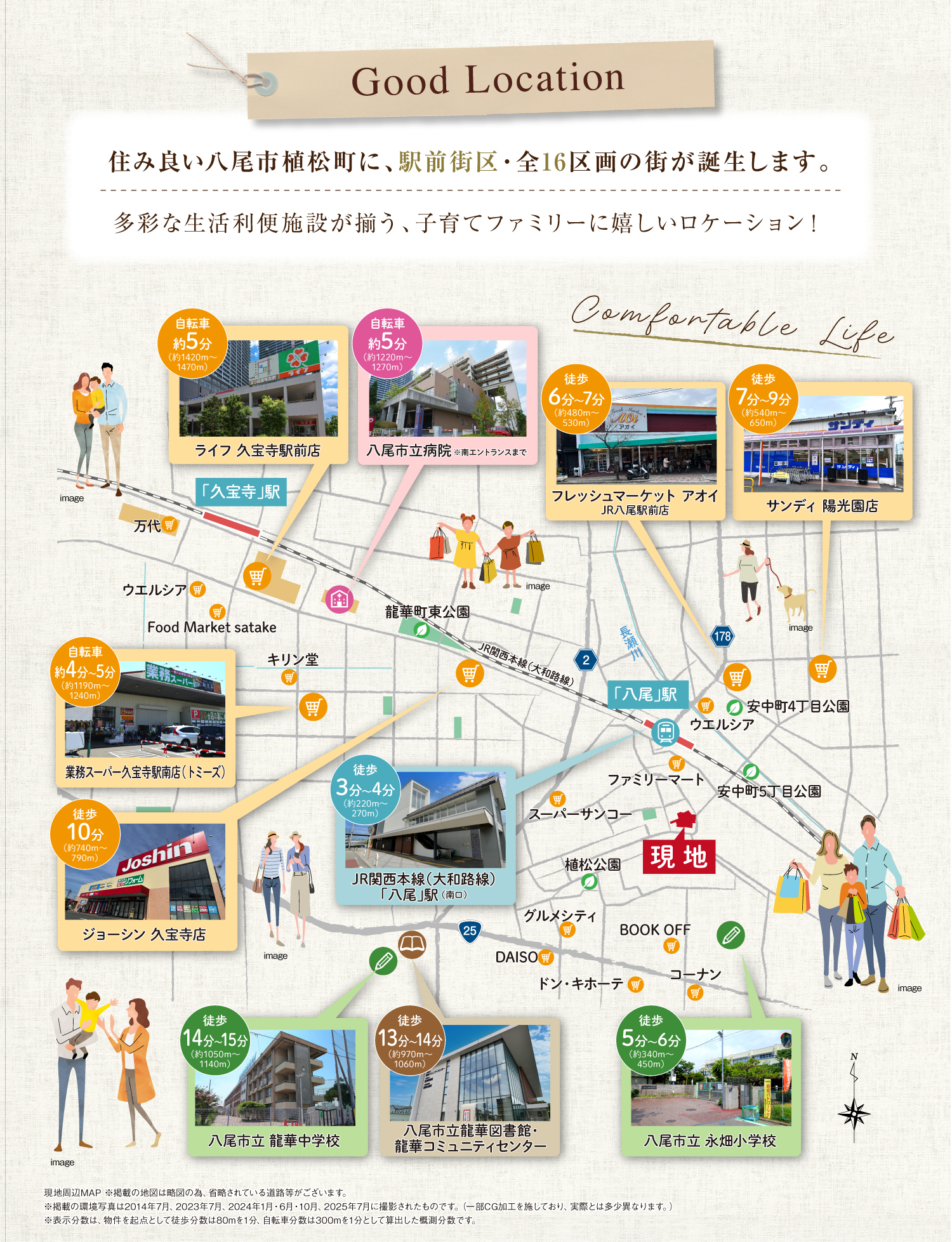 JR大和路線「八尾」駅まで徒歩3分~4分(約220m~約270m)※南口まで JR大和路線・おおさか東線「久宝寺」駅まで徒歩20分~21分(約1560m~約1610m)※南口まで 近鉄バス「JR八尾駅前」停まで徒歩5分(約350m~約400m)※70/71/72/73 八尾線|7 久宝寺線(北系統) 近鉄大阪線「近鉄八尾」駅まで徒歩25分~26分(約1930m~約2040m)※中央南口まで