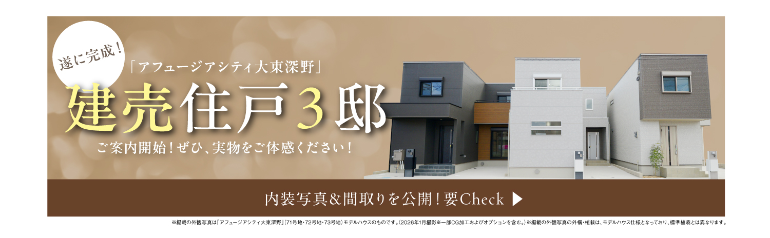 ※1:掲載の外観写真・内装写真は「アフュージアシティ大東深野」(1号地・52号地・53号地)モデルハウスのものです。(2025年11月撮影)※一部CG加工およびオプションを含む。)