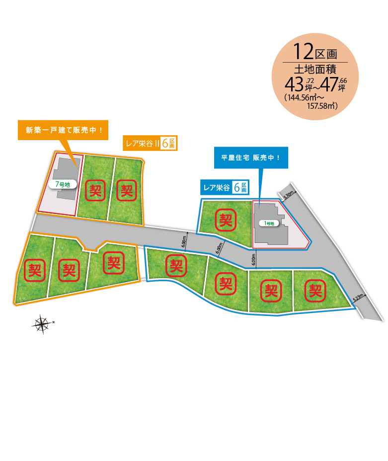 総区画数 13区画 レア栄谷:7区画(うち当社分譲6区画)、レア栄谷Ⅱ:6 区画 用途地域 レア栄谷、レア栄谷Ⅱ1・2号地、6・7号地の一部:準住居地域