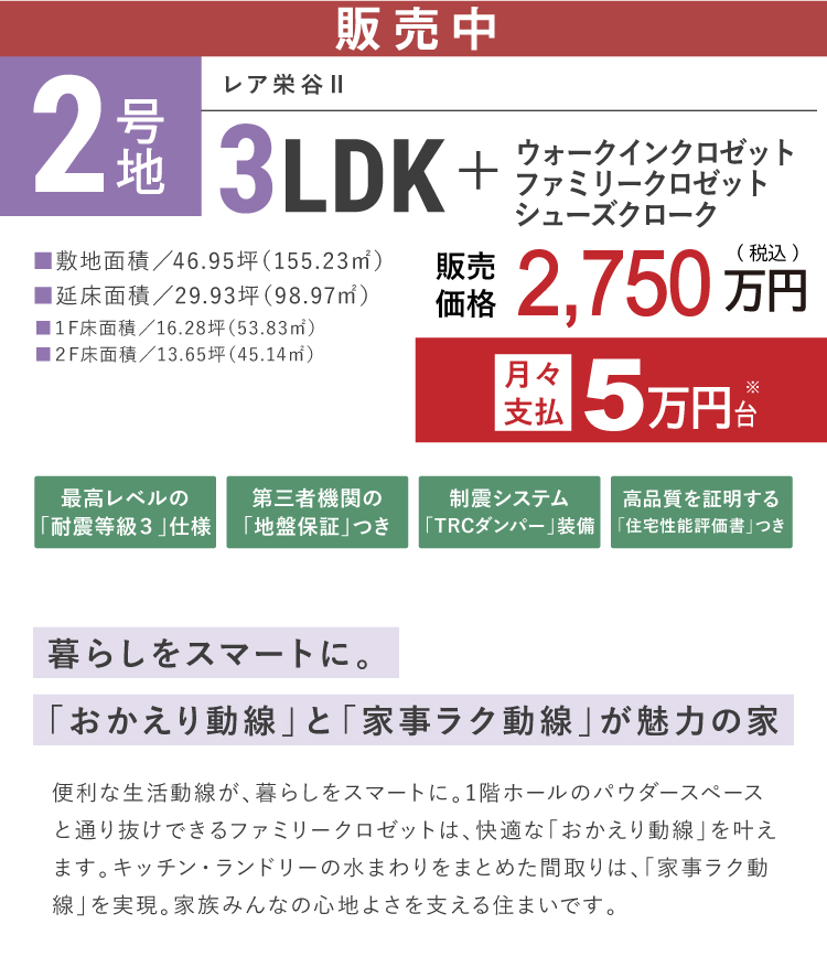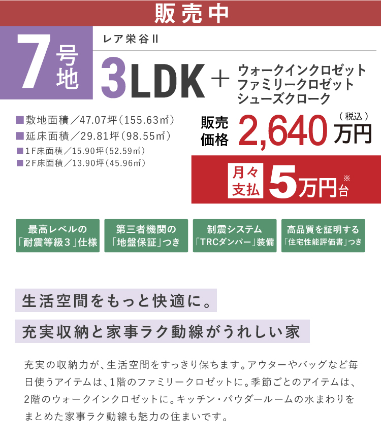 ※建物竣工時期について建設中の場合は、建物が完成する時期を、完成済みの場合は建築された年月を表示しています。区画名称 レア栄谷Ⅱ 2号地・7号地 販売戸数 2 戸 販売価格 2号地:2,750万円(税込)7号地:2,640万円(税込) 外構・付帯工事費 販売価格に含む 間取り 3LDK+FC+WIC+SC 建物面積 2号地:98.97m2(29.93坪)