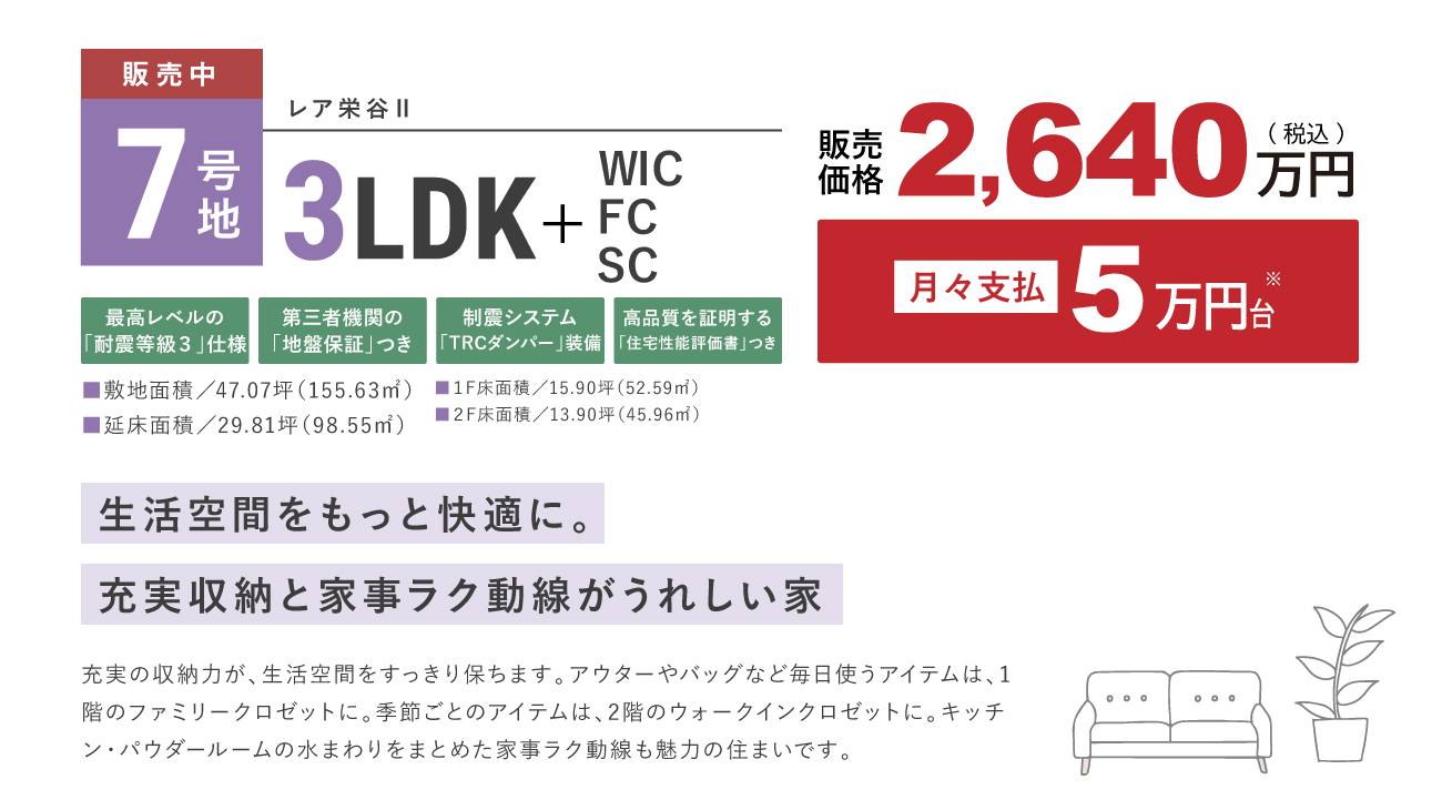 ※40年返済での計算です。※当社提携銀行ローン0.87%/2,640万円の物件を頭金0円で2,640万円借入れの場合※月々返済/55,274円※ボーナス返済(年2回)/約6万円(1回分)※当社提携銀行ローン年0.87%(変動金利)元利均等払い・現行金利3.075%から-2.205%優遇金利を適用した場合の計算例です。※金利は変更される場合があります。※融資限度額/購入価格が融資限度額(100万円以上2億円以内・10万円単位)。※融資限度額の割合/物件価格の最高110%以内(各金融機関による)。※銀行融資手数料/お借入金額×~2.2%(各金融機関による)。※金融機関事務手数料/66,000円(各金融機関による)。※団体信用生命保険/加入要。※当社事務手数料/110,000円(税込)。上記金利は2025年10月1日現在のものです。上記金利は一定の条件を満たす方の例です。 ※FC=ファミリークロゼット、WIC=ウォークインクロゼット、SC=シューズクローク※掲載の間取り図、外構図は図面を基に描き起こしたイメージにつき、実際とは一部異なる場合があります。※間取図の家具・車の表記はイメージ配置になり、実際には付きません。(2025年12月時点)