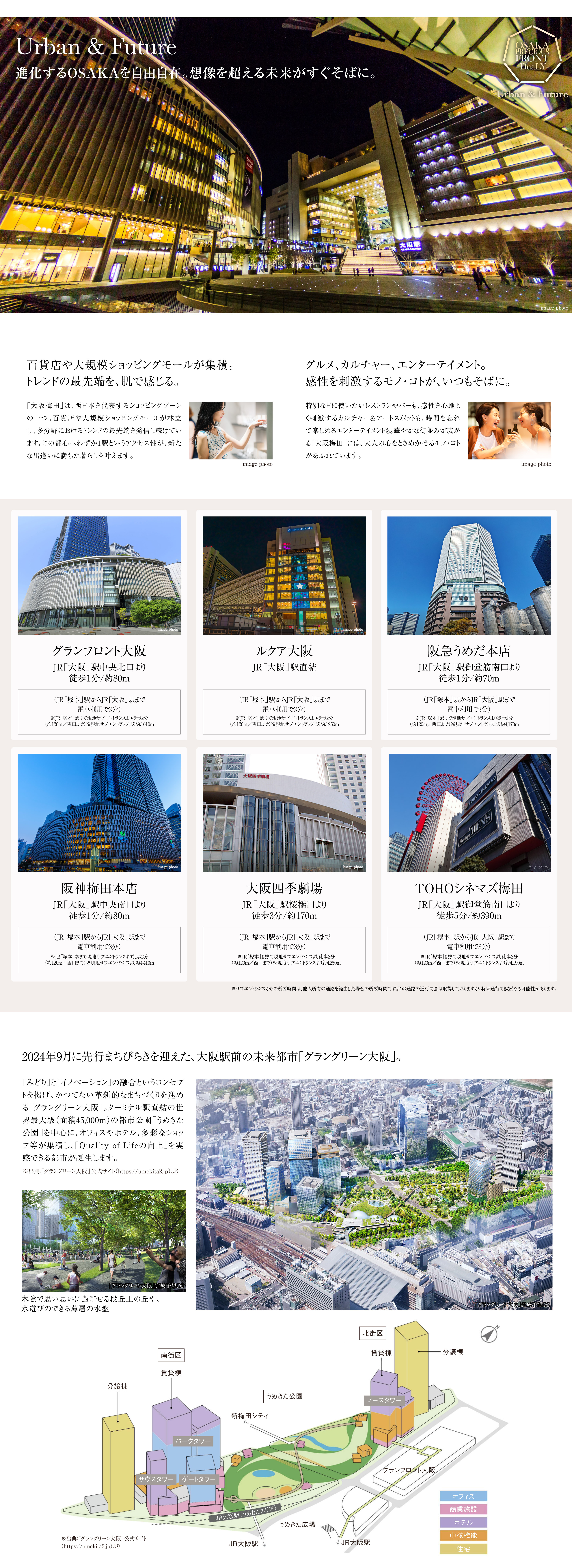 ※掲載の写真は、梅田方面を撮影した航空写真(2024年4月撮影)をCG加工・合成したもので実際とは異なります。掲載の完成予想図は、図面を基に描き起こしたもので、官公庁の指導、施工上の都合等により、建物の形状・色調等、実際とは異なります。また、エアコン室外機・給湯器・TVアンテナ等再現されていない設備機器等がございます。