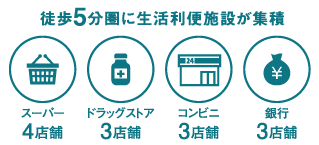 駅前にはスーパーやコンビニ、ドラッグストアもあり、毎日のお買い物をサッと済ませられるところも嬉しい。