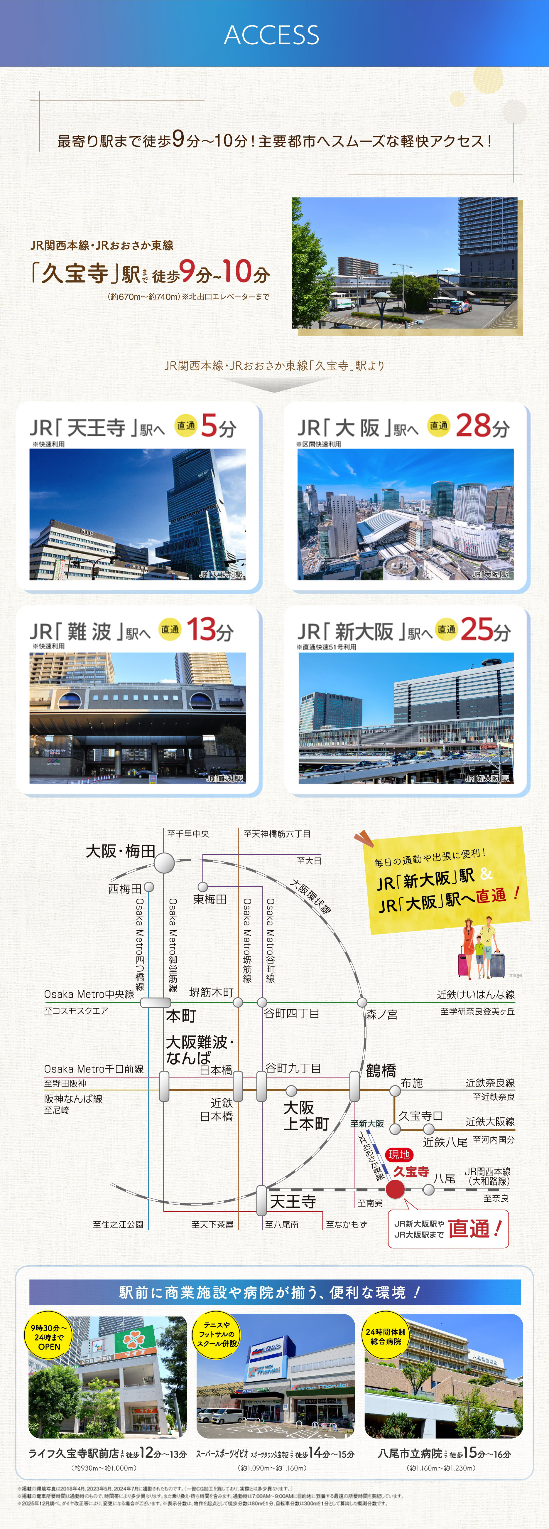 ※1:JR関西本線・JRおおさか東線「久宝寺」駅まで 徒歩9分〜徒歩10分(約670m〜約740m※北出口エレベーターまで)