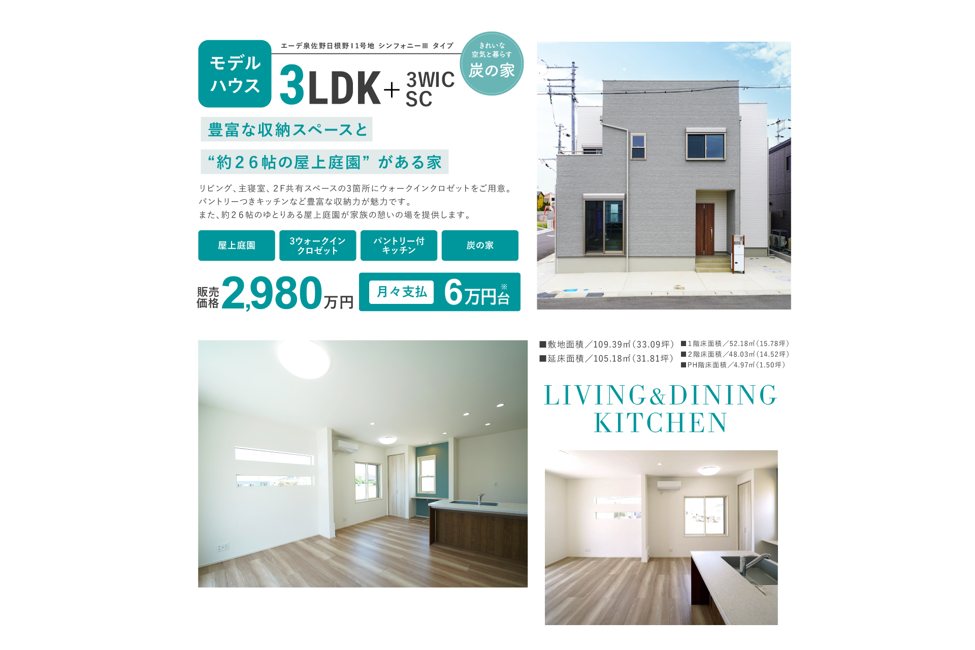※40年返済での計算です。※当社提携銀行ローン0.87%/2,980万円の物件を頭金0円で2,980万円借入れの場合※月々返済/63,664円※ボーナス返済(年2回)/約6.0万円(1回分)※当社提携銀行ローン 年0.87%(変動金利)元利均等払い・現行金利3.075%から-2.205%優遇金利を適用した場合の計算例です。※金利は変更される場合があります。※融資限度額/購入価格が融資限度額(100万円以上2億円以内・10万円単位)。※融資限度額の割合/物件価格の最高110%以内(各金融機関による)。※銀行融資手数料/お借入金額 ×~2.2%(各金融機関による)。※金融機関事務手数料/66,000円(各金融機関による)。※団体信用生命保険/加入要。※当社事務手数料/110,000円(税込)。上記金利は2025年10月1日現在のものです。上記金利は一定の条件を満たす方の例です。※販売価格には消費税(10%)相当額が含まれます。※販売価格には外構・付帯工事費が含まれます。※諸費用/自治会費、登記費用、並びに住宅ローンご利用の方は利用するローンの規定と利用形態に応じた保証料・事務手数料及び火災保険料等が必要になります。※間取図・外構等は図面を基に描いたイメージにつき、実際とは一部異なる場合があります。(2025年7月時点)※間取図の家具・車の表記はイメージ配置になり、実際には付きません。 ※WIC=ウォークインクロゼット、SC=シューズクローク。