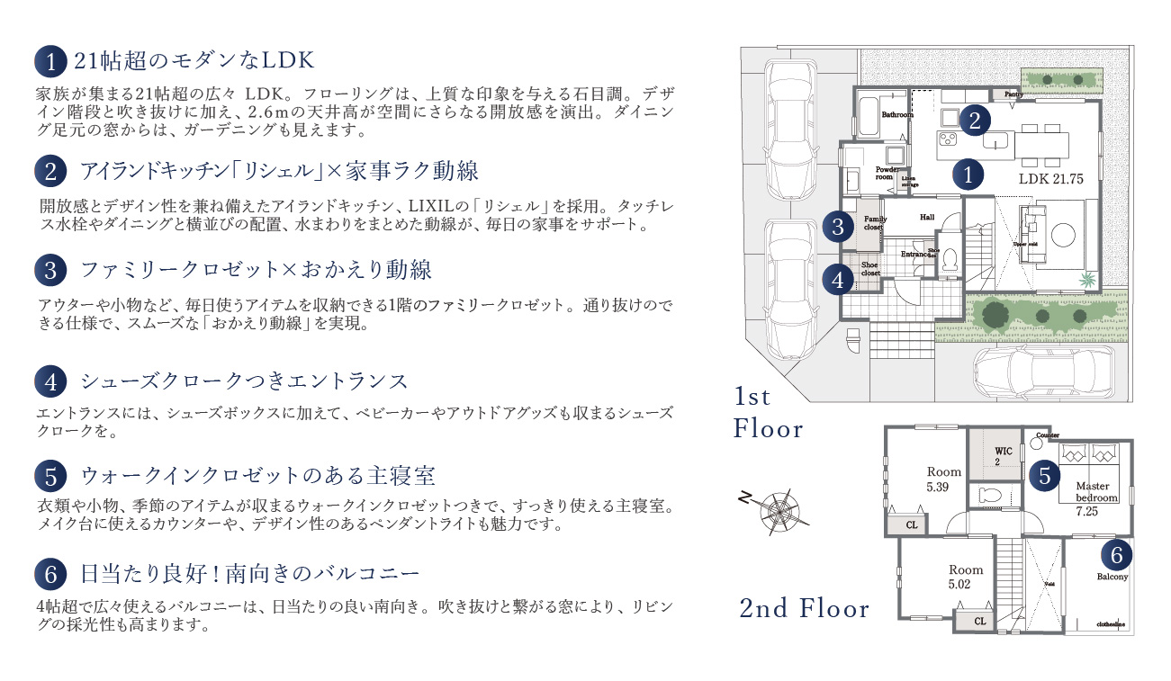 ※間取図・外構等は図面を基に描いたイメージにつき、実際とは一部異なる場合があります(2025年9月時点)。※間取図の家具の表記はイメージ配置になり、実際とは一部異なる場合があります。※掲載の外観・内観写真は2025年9月に現地モデルハウスにて撮影されたもので、一部CG加工を施しております。※FC=ファミリークロゼット、WIC=ウォークインクロゼット、SC=シューズクローク。