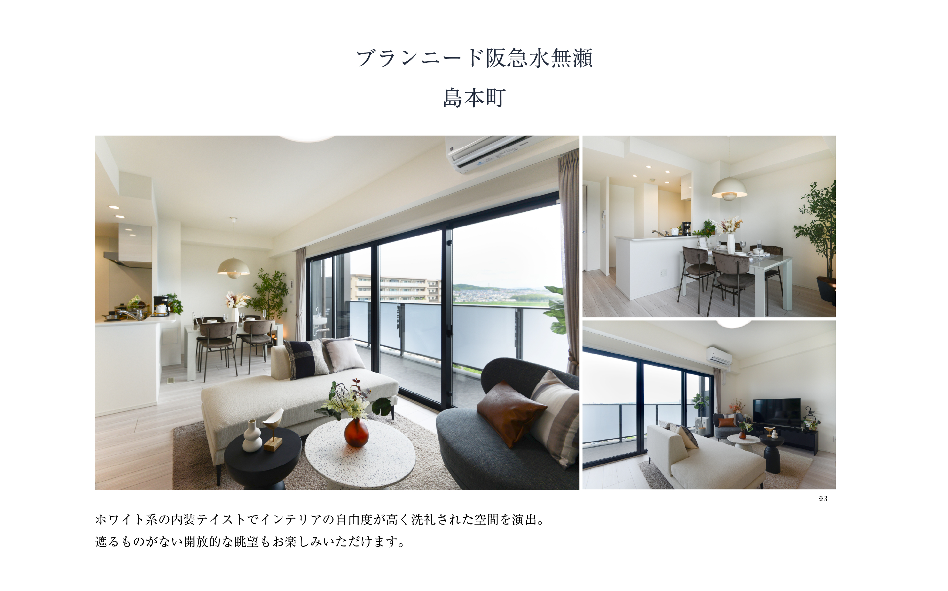 ※3 掲載の室内写真はブランニード阪急水無瀬の棟内モデルルーム[Bタイプ]を2025年9月に撮影したものに一部CG処理を施したものです。家具・調度品・照明器具などは販売価格に含まれておりません。また、設備・仕様等が変更になる場合がござます。