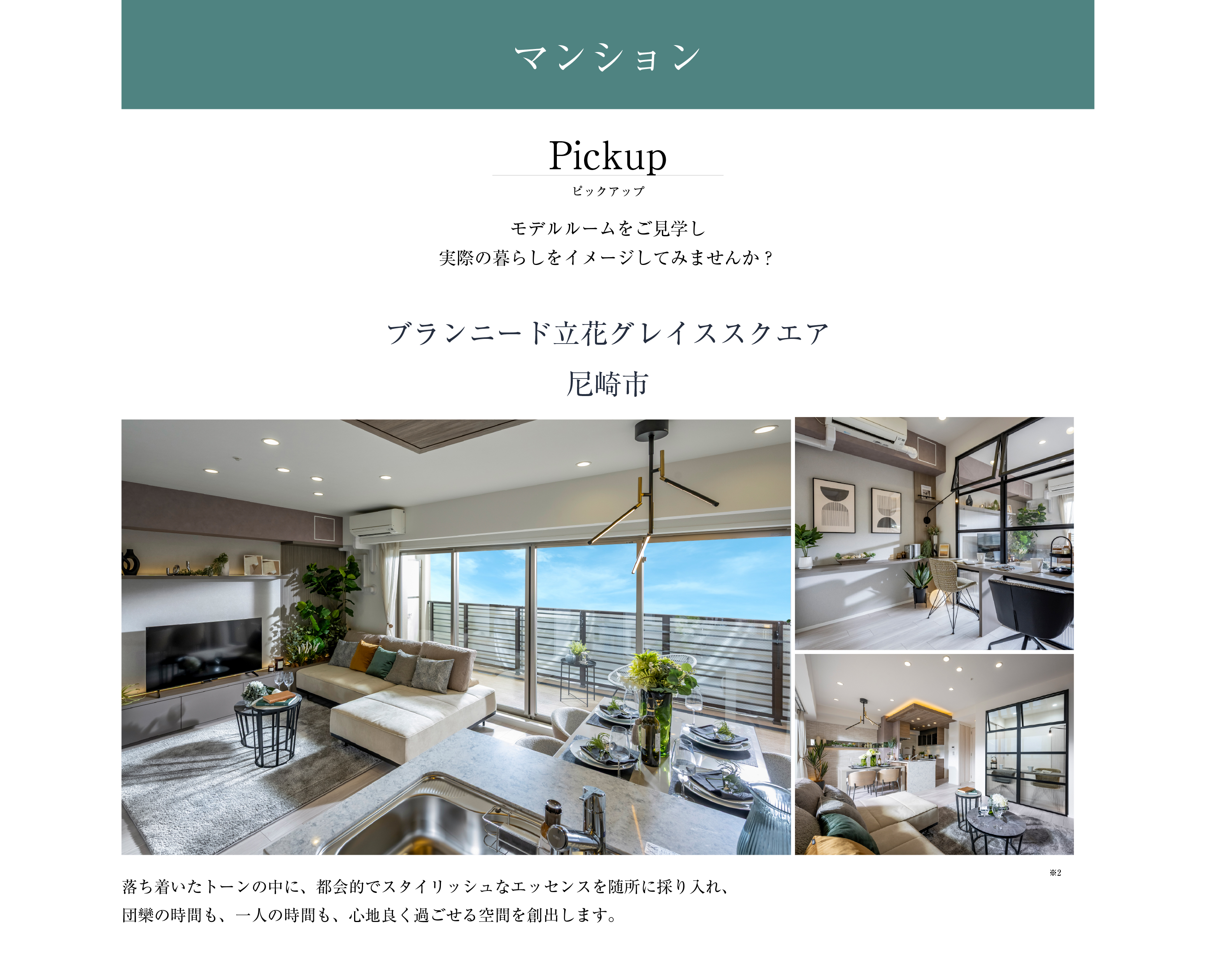 ※2 掲載の室内写真はブランニード立花グレイススクエアのモデルルーム[Fタイプ・メニュー3]を2025年6月に撮影したものに一部CG処理を施したものです。有償オプション・家具・調度品・照明器具などは販売価格に含まれておりません。メニュープラン、カラーセレクトおよびオプション(有償)には申込期限がございます。また、設備・仕様等が変更になる場合がございます。
