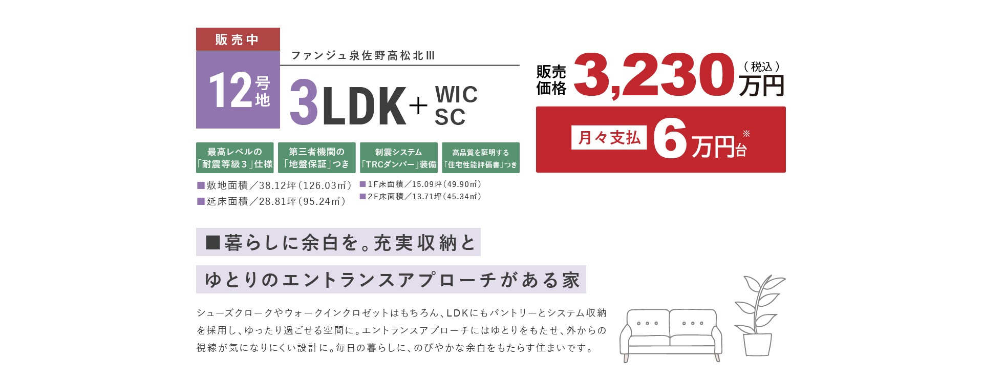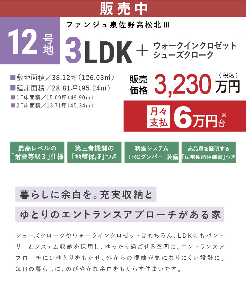 区画名称 ファンジュ泉佐野高松北Ⅲ 12号地 販売戸数 1 戸 販売価格 3,230万円 外構・付帯工事費 販売価格に含む 間取り 3LDK+WIC+SC 建物面積 95.24㎡ (28.81坪) 土地面積 126.03m2(38.12坪)※路地状部分約37㎡含む 完成時期(築年月) 2026年4月 建築確認番号 第R07確認建築近確0002200号(2025年11月6日) 販売スケジュール 先着順 入居時期 2026年8月以降 構造・規模 木造(在来軸組工法) 取引条件の有効期限 2026年1月13日 売主 フジ住宅株式会社 問い合わせ 0120-24-0413 ※諸費用/自治会費、登記費用、並びに住宅ローンご利用の方は利用するローンの規定と利用形態に応じた保証料・事務手数料及び火災保険料等が必要になります。 ※先着順につき、契約済の場合がございます。あらかじめご了承ください。 ※販売価格には、消費税(10%)相当額が含まれます。