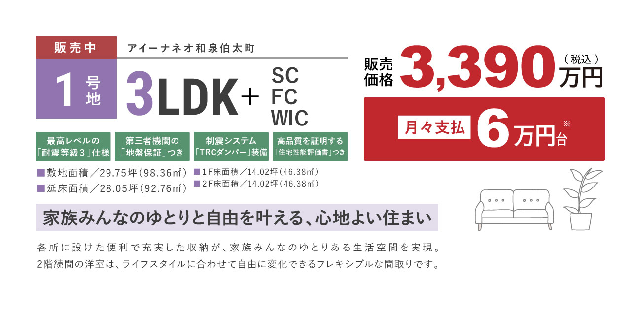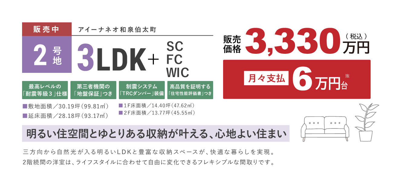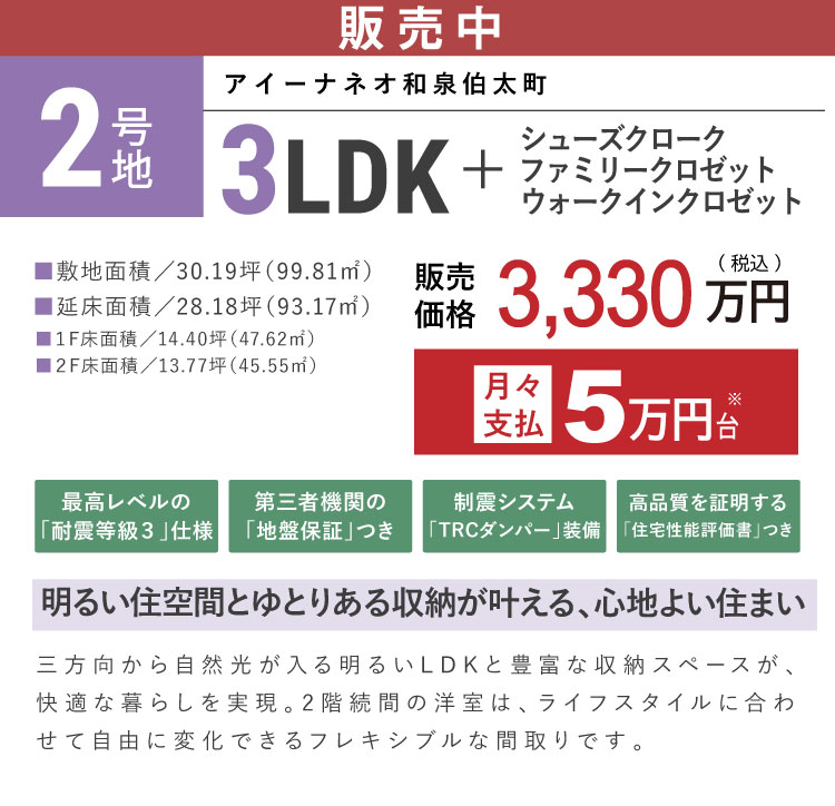 区画名称 アイーナネオ和泉伯太町 販売戸数 2 戸 販売価格 1号地:3,390万円2号地:3,330万円 間取り 3LDK+SC+FC+WIC 建物面積 1号地:92.76m2(28.05坪)2号地:93.17m2(28.18坪) 土地面積 1号地:98.36m2(29.75坪)別途持分1.3m22号地:99.81m2(30.19坪)別途持分1.01m2 完成時期(築年月) 2026年1月 建築確認番号 1号地:R07確認建築近確0000937号 2025/7/232号地:R07確認建築近確0000938号 2025/7/23 販売スケジュール 先着順 入居時期 建物完成後3ヵ月 構造・規模 木造2階建て 取引条件の有効期限 2025年10月21日 売主 フジ住宅株式会社 問い合わせ 0120-24-0413 ※諸費用/自治会費、登記費用、並びに住宅ローンご利用の方は利用するローンの規定と利用形態に応じた保証料・事務手数料及び火災保険料等が必要になります。 ※先着順につき、契約済の場合がございます。あらかじめご了承ください。 ※諸費用/自治会費、登記費用、並びに住宅ローンご利用の方は利用するローンの規定と利用形態に応じた保証料・事務手数料及び火災保険料等が必要になります。