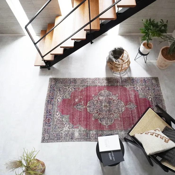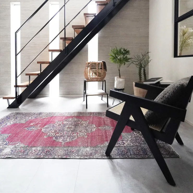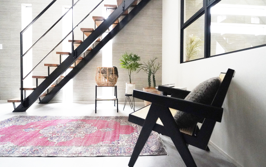 静かに佇む黒のラウンジチェアで、余白時間を堪能するエントランスホール。 シースルー階段が映えるのびやかな吹き抜け空間に、ヴィンテージラグの彩りがやわらかな温度を添えます。