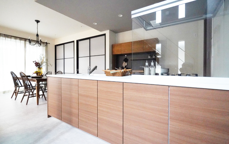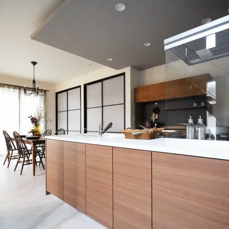 3枚のガラス扉を通してエントランスホールとシームレスに繋がるペニンシュラキッチン。日常の料理時間を、少し特別なひとときへ誘います。デザイン天井は、空間のさりげないアクセントに。