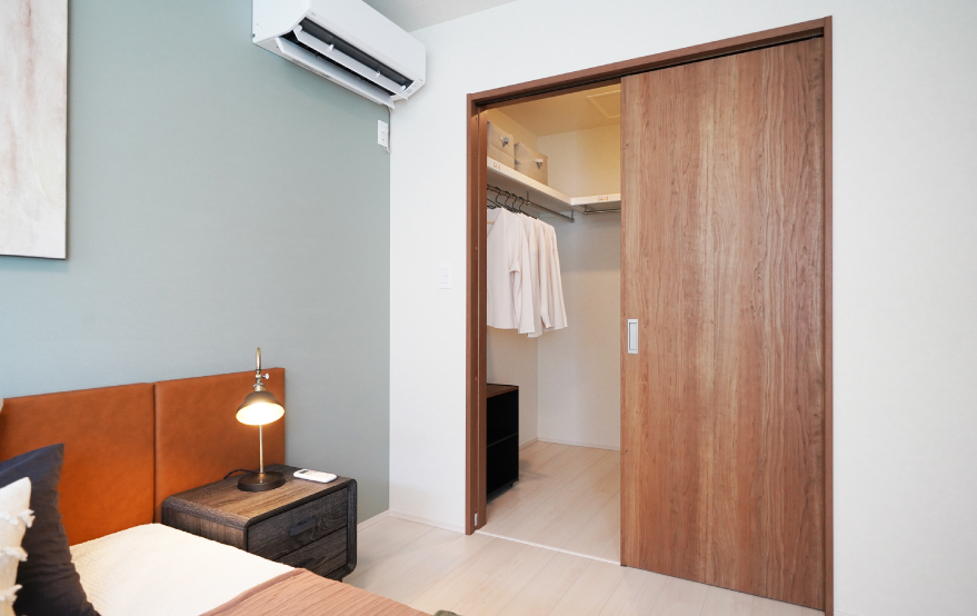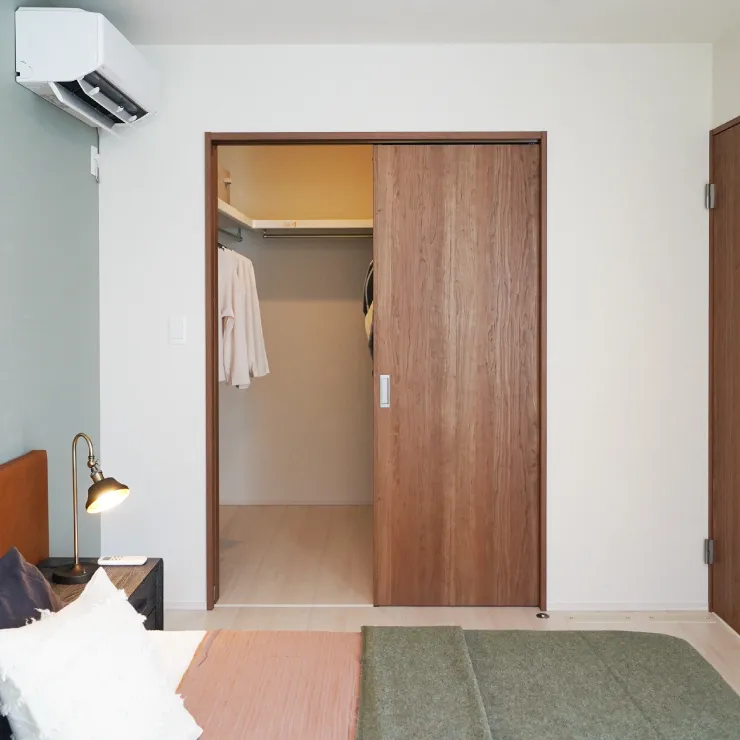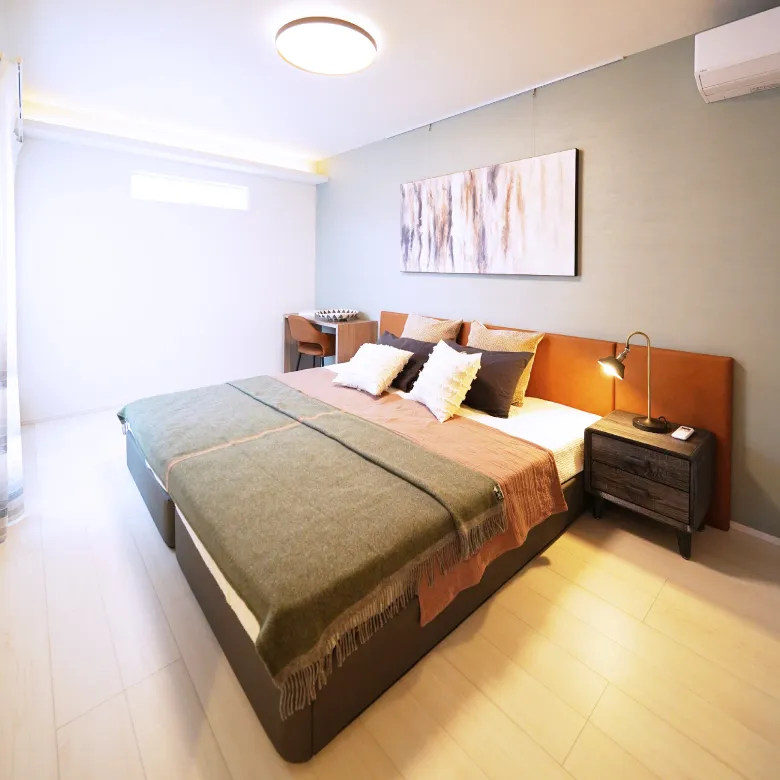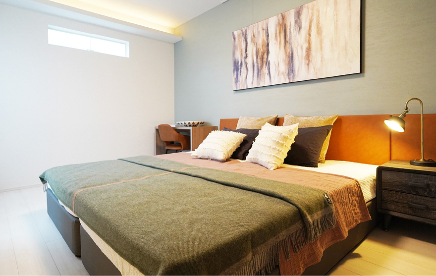低めに設えたツインベッドが空間に安定感をもたらし、落ち着きのある佇まいに。アクセントウォールとアート、コーブ照明が上質な陰影を描きます。ウォークインクローゼット付きで、衣類や季節のアイテムもすっきりと収まります。