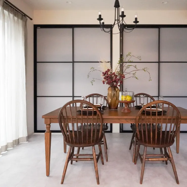 モノトーン基調のシンプルな背景に、無垢のテーブルとチェアが美しく映える空間。ブラックのシャンデリアがほどよい緊張感を添え、上質さと落ち着きを演出します。