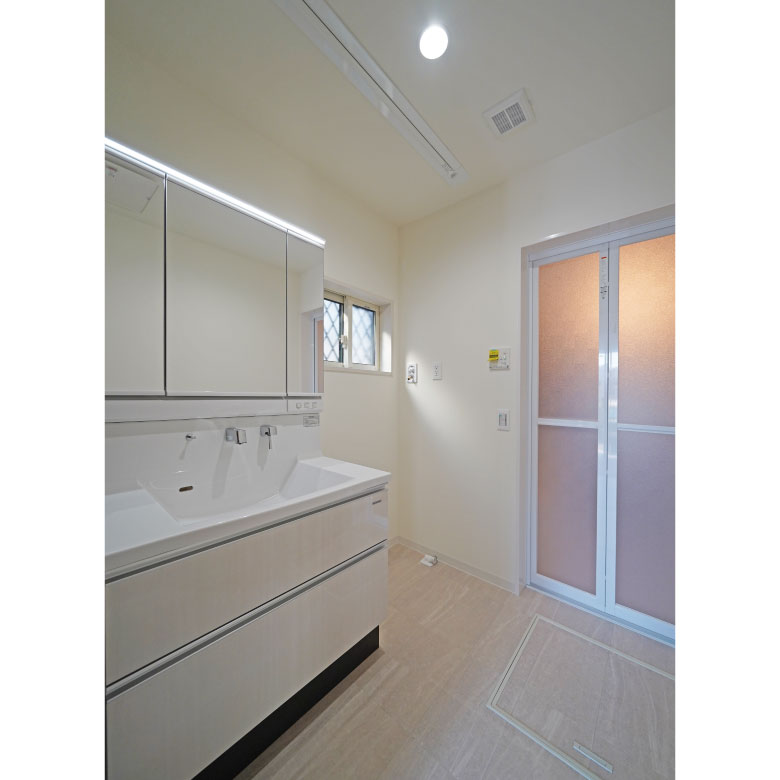 室内干しができる「ホスクリーン昇降式」つきのパウダールームは、ファミリークロゼット隣接。洗濯時の家事動線を快適に。