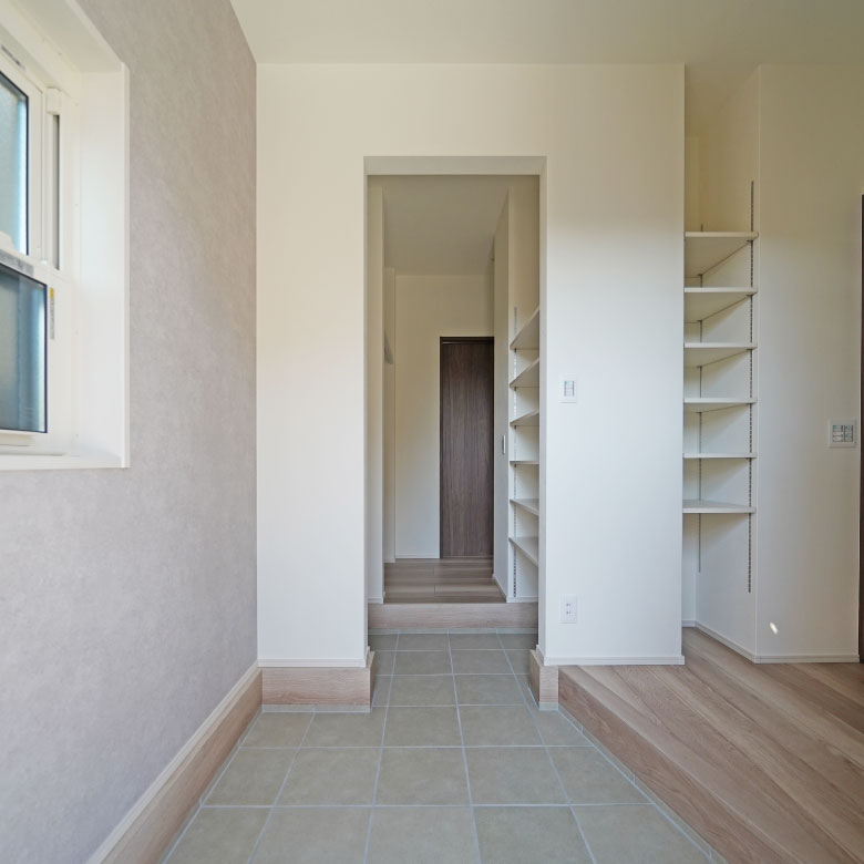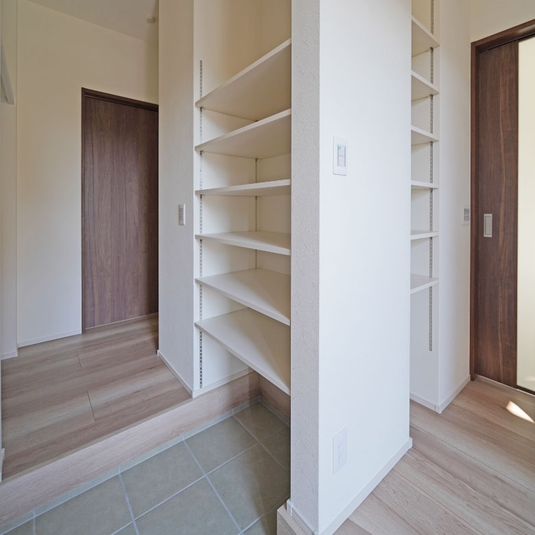 エントランスには、シューズボックスに加えて、ベビーカーやアウトドアグッズも収まるシューズクロークを。