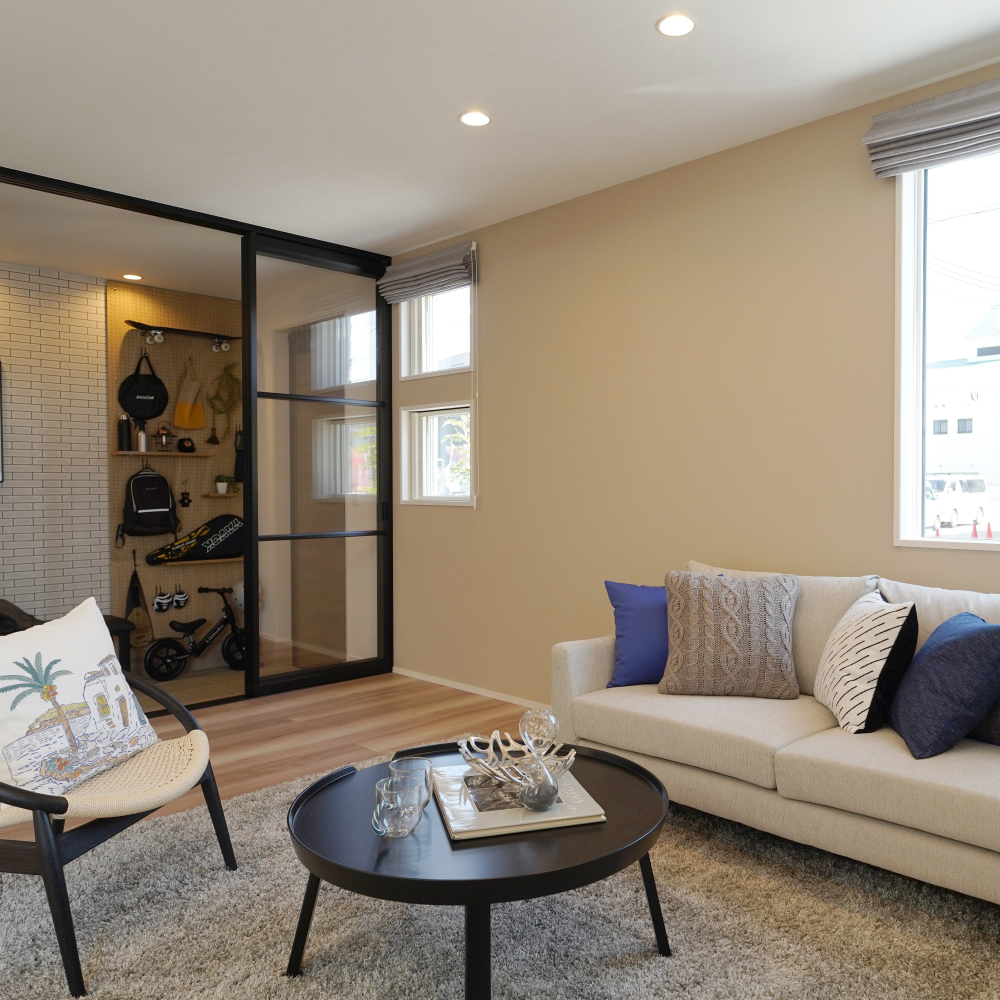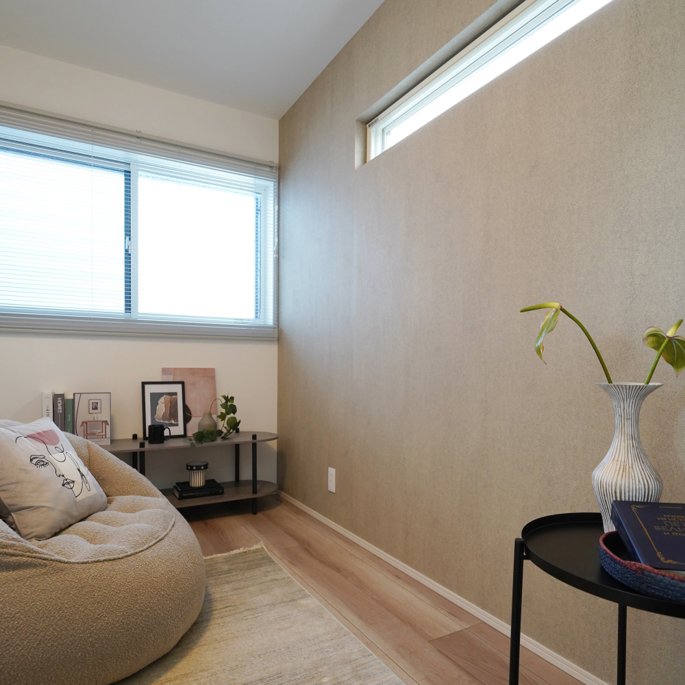 - LDK隣接のモダン和室は、のんびりくつろぐ癒しの場。掃き出し窓からはプライベートテラスが見え、アウトドア空間との心地よい一体感を生み出します。