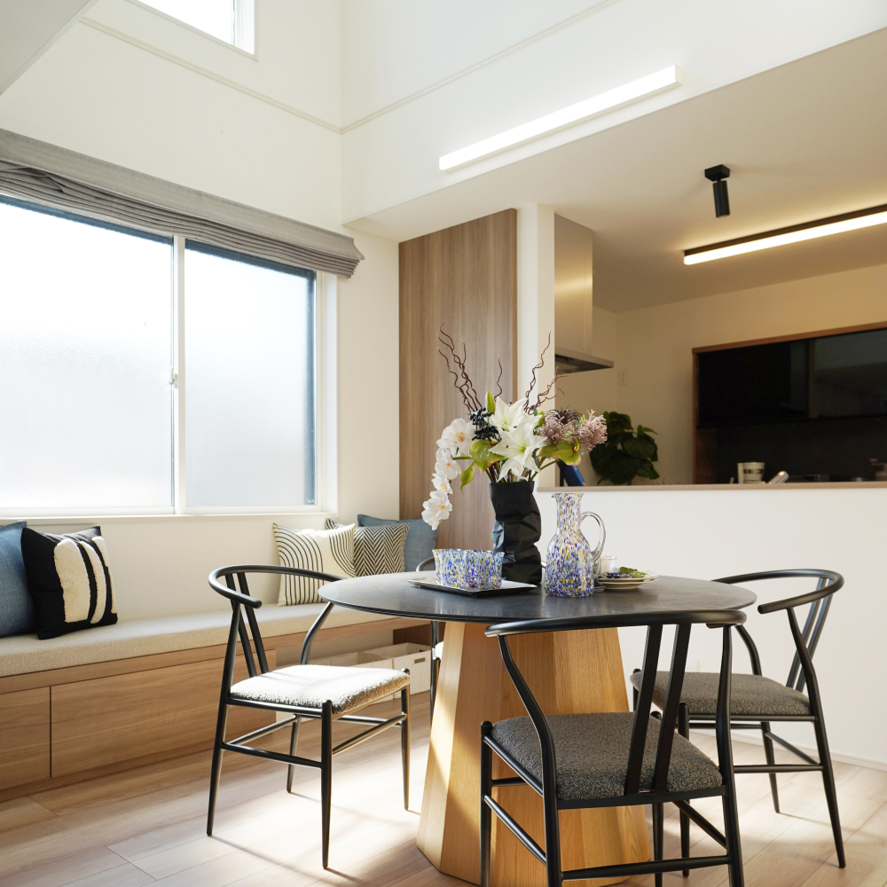 ダイニング・キッチン- 吹き抜けをそなえたダイニングは、開放感あふれる空間に。ダイニングテーブルには、軽やかさを演出するチューリップテーブルを採用。家族との会話が弾む対面キッチンで、お子さまを見守りながらクッキング。