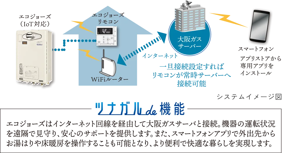 リモコンを大阪ガスサーバに接続することで、エコジョーズの運転状況を大阪ガスが遠隔で見守ります。万が一、故障やエラーが発生した場合には、スマホアプリに対処方法等を記載した通知を行います。