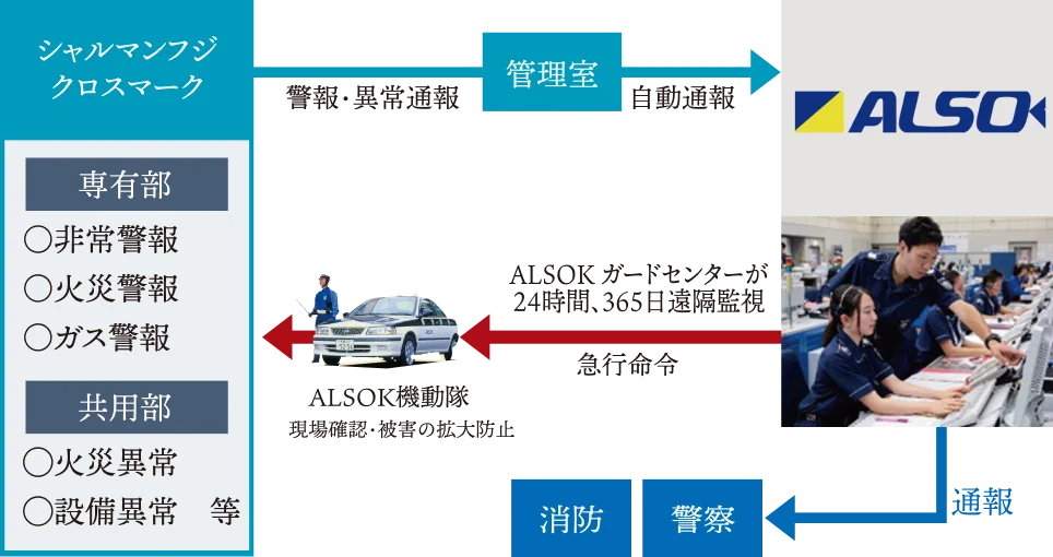 ALSOK株式会社と連携したセキュリティネットワークを導入。異常を感知した場合、『シャルマンフジ クロスマーク』の「お客様センター」が専門会社への出動依頼を実施し、ALSOK株式会社は警報受信後、状況に応じて適切な対処で皆様の安全を守ります。