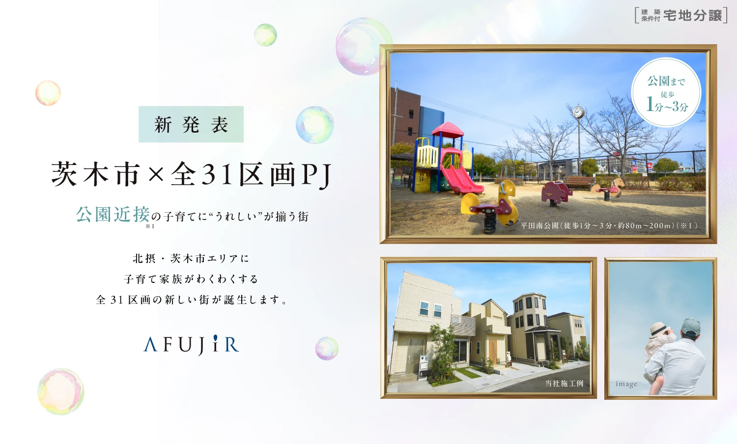 総区画数 31 区画 (A街区:20区画、B街区:11区画の合計)※モデルハウス・建売含む 用途地域 第二種中高層住居専用地域 地目 A街区:雑種地、B街区:宅地 ※引渡しまでに宅地に変更 建ペイ率 60%・70% 容積率 200% 道路幅員 物件間:9.23m~10.83m(市道)、北側:6.55m~6.95(市道)、西側:4.60m(市道)、南側4.8m(市道) 私道負担 無し 土地面積 100㎡~115㎡(A街区:100㎡~115㎡、B街区:101.69㎡~112.73㎡) 開発許可番号 A街区:茨木市指令審第63号(令和7年10月1日)、B街区:茨木市指令審第62号(令和7年10月1日) 開発面積 A街区 2,296.86㎡、B街区 1,202.61㎡ 造成工事完了時期 A街区:2026年7月下旬予定、B街区:2026年4月上旬予定 設備概要 電気:関西電力、ガス:都市ガス、水道:公営水道、下水:公共下水 その他法令 準防火地域、第二種高度地区、市街化区域、宅地等規制区域、景観法、居住誘導区域 売主 フジ住宅株式会社