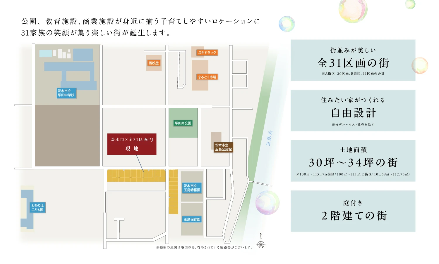 物件名称 (仮称)茨木市|全31区画|幼稚園隣接のビッグタウンプロジェクト 所在地 A街区:大阪府茨木市平田2丁目190番1と190番3を合筆して分筆する土地(地番)、B街区:大阪府茨木市平田2丁目200番他(地番) 交通 阪急京都線「茨木市」駅までバス12分、近鉄バス「玉島一丁目」停まで徒歩4分~6分