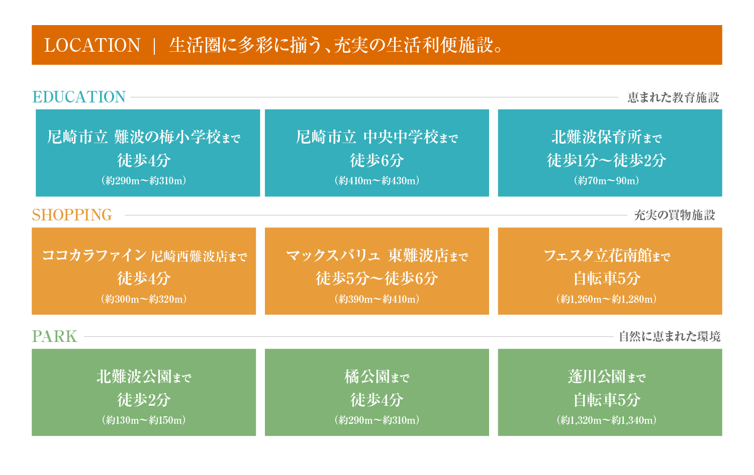 尼崎市立中央北生涯学習プラザまで・・・徒歩3分~4分(約230m~250m) 尼崎西難波北郵便局まで・・・徒歩5分(約350m~370m) 尼崎南警察署西難波交番まで・・・徒歩6分(約450m~470m) 尼崎市役所まで・・・徒歩6分~7分(約480m~500m) ベイコム総合体育館まで・・・徒歩25分/自転車7分(約1,930m~1,950m)