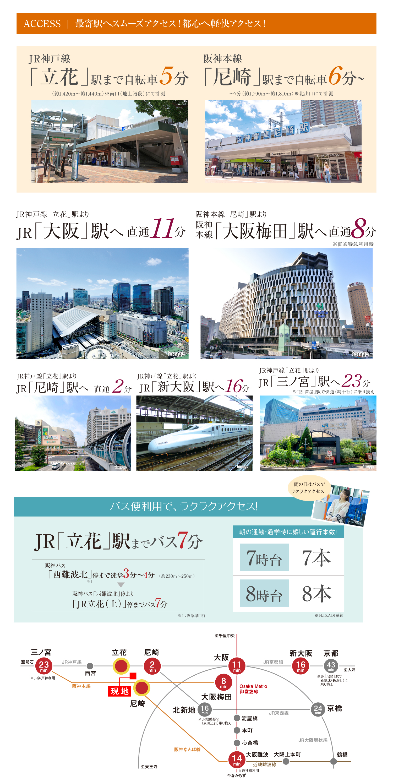 JR神戸線「立花」駅※南口(地上階段)まで・・・徒歩18分/自転車5分(約1,420m~1,440m) 阪神本線「出屋敷」駅 ※東出口まで・・・徒歩20分/自転車6分(約1,540m~1,560m) 阪神本線「尼崎」駅 ※北出口まで・・・徒歩23分/自転車6分~7分(約1,790m~1,810m) JR神戸線「尼崎」駅 ※北口西側まで・・・徒歩35分/自転車10分(約2,760m~2,780m) 阪神バス「西難波北」停※阪急塚口行まで・・・徒歩3分~4分(約230m~250m) 阪神バス「東難波町2丁目」停※阪神尼崎行まで・・・徒歩4分(約250m~270m)