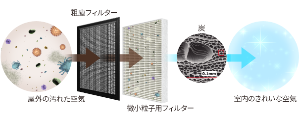 「フジ住宅の炭の家/ピュアエア」では、屋外の空気をファンで強制的に取り入れ、「微小粒子用フィルター」で微小な有害物質をブロック。