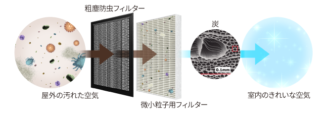「フジ住宅の炭の家/ピュアエア」では、屋外の空気をファンで強制的に取り入れ、「微小粒子用フィルター」で微小な有害物質をブロック。
