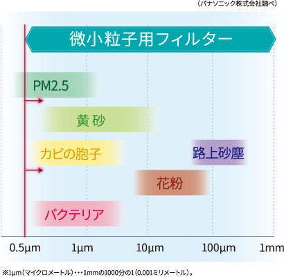 粒径の大きな順に、路上砂塵、花粉、黄砂、バクテリア、カビの胞子、載っていないですがウイルス、PM2.5となります。後の実験結果より、「フジ住宅の炭の家/ピュアエア」に搭載の微小粒子用フィルターが0.5μm以上の粒径のものはほぼ取り除くことが分かりました。また、有害な化学物質ガスについても、後の実験結果より炭がほぼ吸着除去することが分かっています。